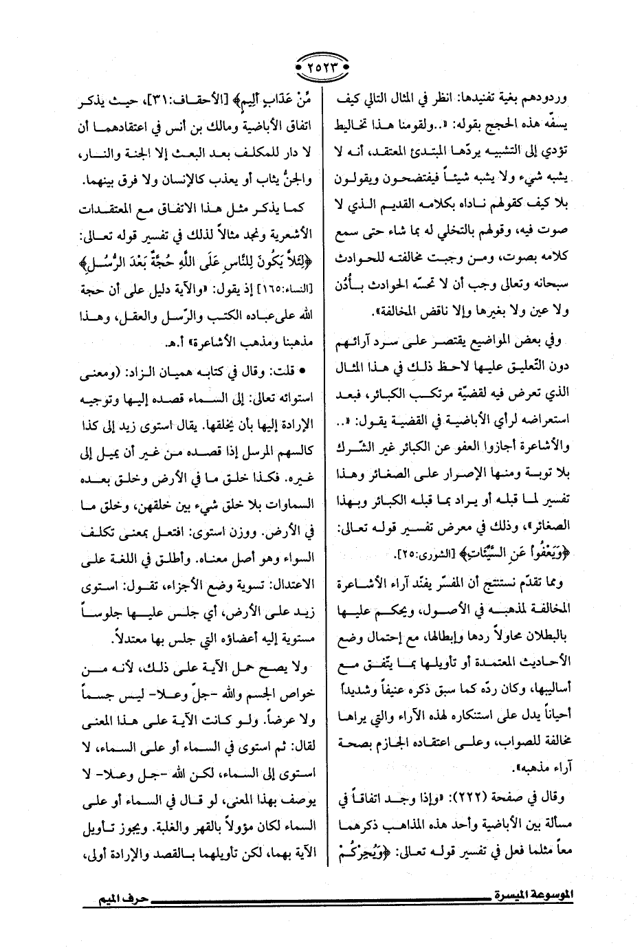 وقال في صفحة (222): "وإذا وجد اتفاقًا في مسألة بين الأباضية وأحد هذه المذاهب ذكرهما معًا مثلما فعل في تفسير قوله تعالى: {وَيُجِرْكُمْ مِنْ عَذَابٍ أَلِيمٍ} [الأحقاف: 31]، حيث يذكر اتفاق الأباضية ومالك بن أنس في اعتقادهها أن لا دار للمكلف بعد البعث إلا الجنة والنار، والجنُّ يثاب أو يعذب كالإنسان ولا فرق بينهما. كما يذكر مثل هذا الاتفاق مع المعتقدات الأشعرية ونجد مثالًا لذلك في تفسير قوله تعالى: {لِئَلَّا يَكُونَ لِلنَّاسِ عَلَى اللَّهِ حُجَّةٌ بَعْدَ الرُّسُلِ} [النساء: 165] إذ يقول: "والآية دليل على أن حجة الله على عباده الكتب والرسل والعقل، وهذا مذهبنا ومذهب الأشاعرة" أ. هـ.