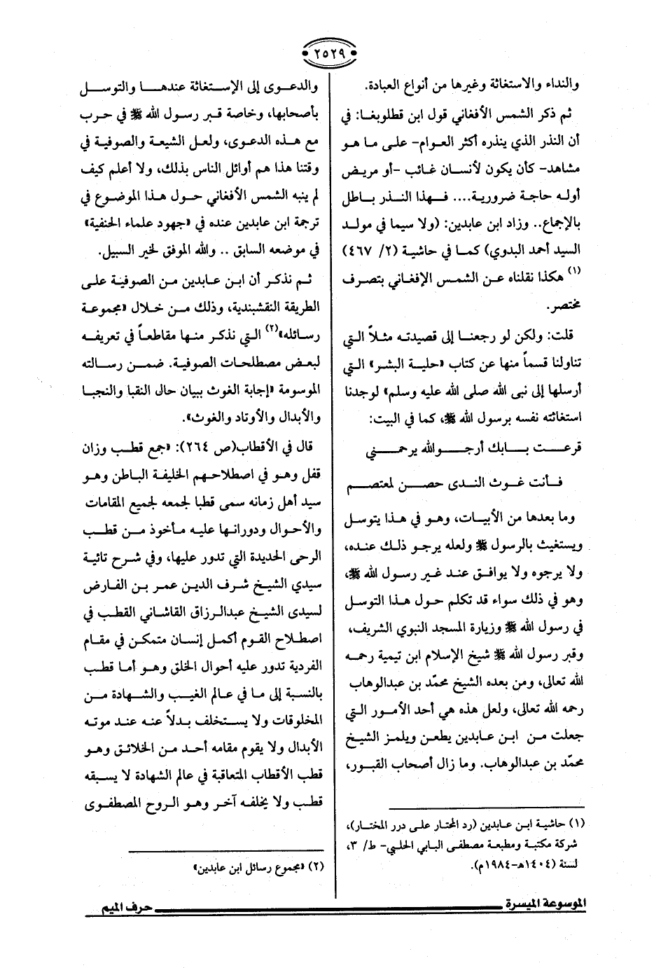 وما بعدها من الأبيات، وهو في هذا يتوسل ويستغيث بالرسول - صلى الله عليه وسلم - ولعله يرجو ذلك عنده، ولا يرجوه ولا يوافق عند غير رسول الله - صلى الله عليه وسلم -، وهو في ذلك سواء قد تكلم حول هذا التوسل في رسول الله - صلى الله عليه وسلم - وزيارة المسجد النبوي الشريف، وقبر رسول الله - صلى الله عليه وسلم - شيخ الإسلام ابن تيمية رحمه الله تعالى، ومن بعده الشيخ محمّد بن عبد الوهاب رحمه الله تعالى، ولعل هذه هي أحد الأمور التي جعلت من ابن عابدين يطعن ويلمز الشيخ محمّد بن عبد الوهاب. وما زال أصحاب القبور، والدعوى إلى الإستغاثة عندها والتوسل بأصحابها، وخاصة قبر رسول الله - صلى الله عليه وسلم - في حرب مع هذه الدعوى، ولعل الشيعة والصوفية في وقتنا هذا هم أوائل الناس بذلك، ولا أعلم كيف لم ينبه الشمس الأفغاني حول هذا الموضوع في ترجمة ابن عابدين عنده في "جهود علماء الحنفية" في موضعه السابق .. والله الموفق لخير السبيل.