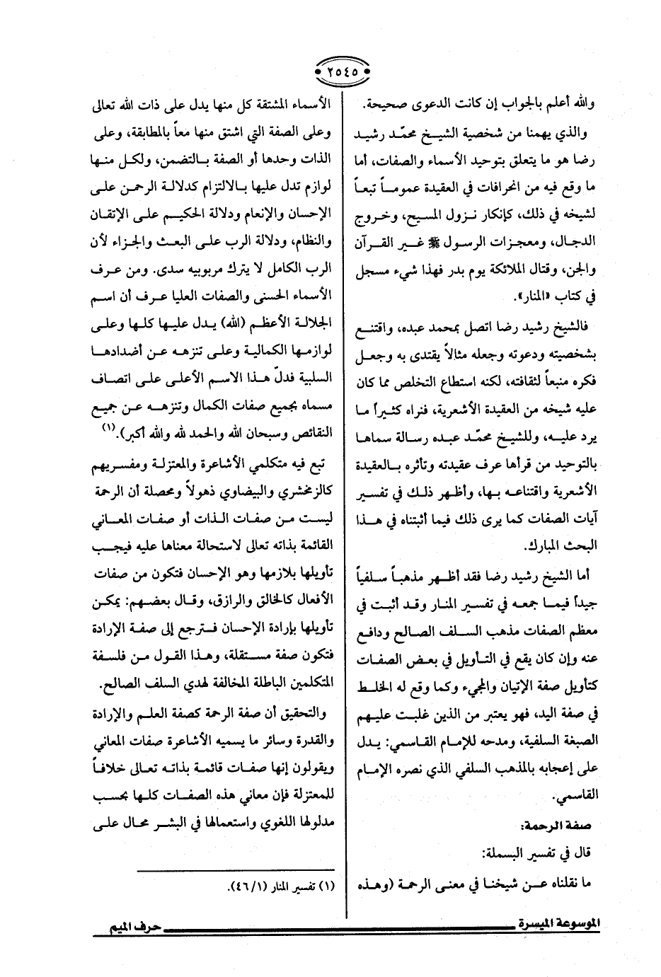 تبع فيه متكلمي الأشاعرة والمعتزلة ومفسريهم كالزمخشري والبيضاوي ذهولًا ومحصلة أن الرحمة ليست من صفات الذات أو صفات المعاني القائمة بذاته تعالى لاستحالة معناها عليه فيجب تأويلها بلازمها وهو الإحسان فتكون من صفات الأفعال كالخالق والرازق، وقال بعضهم: يمكن تأويلها بإرادة الإحسان فترجع إلى صفة الإرادة فتكون صفة مستقلة، وهذا القول من فلسفة المتكلمين الباطلة المخالفة لهدي السلف الصالح.