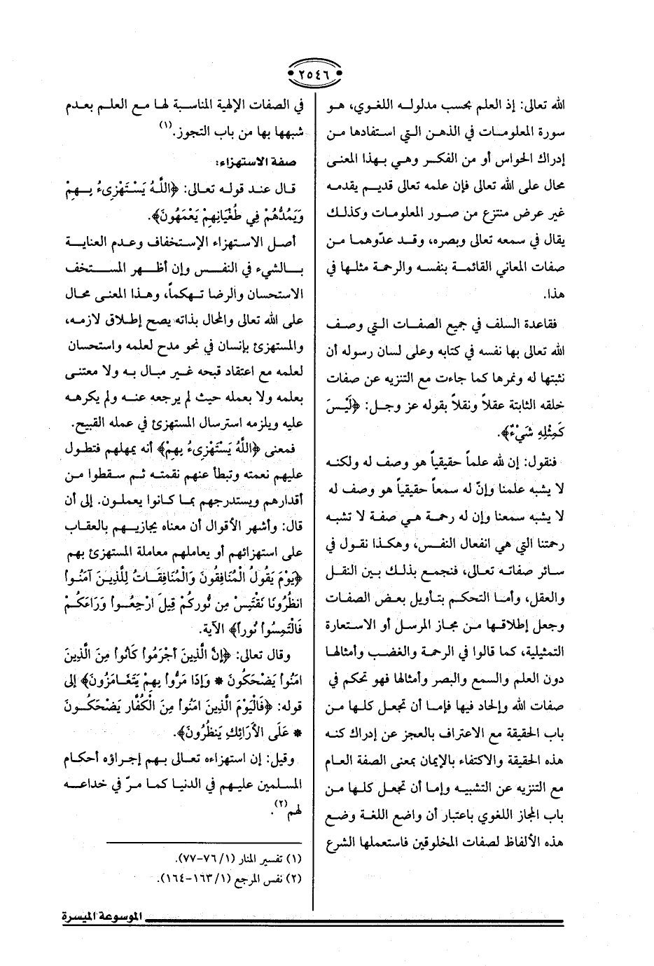 فنقول: إن لله علمًا حقيقيًّا هو وصف له ولكنه لا يشبه علمنا وإن له سمعًا حقيقيًّا هو وصف له لا يشبه سمعنا وإن له رحمة هي صفة لا تشبه رحمتنا التي هي انفعال النفس وهكذا نقول في سائر صفاته تعالى، فنجمع بذلك بين النقل والعقل، وأما التحكم بتأويل بعض الصفات وجعل إطلاقها من مجاز المرسل أو الاستعارة التمثيلية، كما قالوا في الرحمة والغضب وأمثالها دون العلم والسمع والبصر وأمثالها فهو تحكم في صفات الله وإلحاد فيها فإما أن تجعل كلها من باب الحقيقة مع الاعتراف بالعجز عن إدراك كنه هذه الحقيقة والاكتفاء بالإيمان بمعنى الصفة العام مع التنزيه عن التشبيه وإما أن تجعل كلها من باب المجاز اللغوي باعتار أن واضع اللغة وضع هذه الألفاظ لصفات المخلوقين فاستعملها الشرع في الصفات الإلهية المناسبة لها مع العلم بعدم شبهها بها من باب التجوز. (¬1)