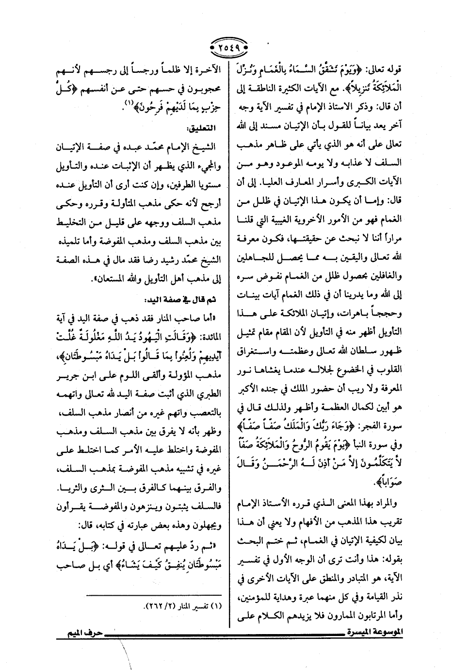 "أما صاحب المنار فقد ذهب في صفة اليد في آية المائدة: {وَقَالتِ الْيَهُودُ يَدُ اللَّهِ مَغْلُولَةٌ غُلَّتْ أَيدِيهِمْ وَلُعِنُوا بِمَا قَالُوا بَلْ يَدَاهُ مَبْسُوطَتَانِ}، مذهب المؤولة وألقى اللوم على ابن جرير الطبري الذي أثبت صفة اليد لله تعالى واتهمه بالتعصب واتهم غيره من أنصار مذهب السلف، وظهر بأنه لا يفرق بين مذهب السلف ومذهب المفوضة واختلط عليه الأمر كما اختلط على غيره في تشبيه مذهب المفوضة بمذهب السلف، والفرق بينهما كالفرق بين الثرى والثريا. فالسلف يثبتون وينزهون والمفوضة يقرأون ويجهلون وهذه بعض عبارته في كتابه، قال: