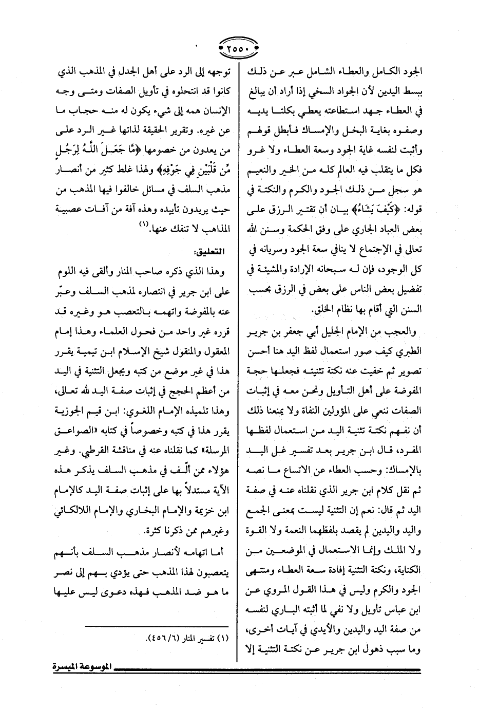 والعجب من الإمام الجليل أبي جعفر بن جرير الطبري كف صور استعمال نفظ اليد هنا أحسن تصوير ثم خفيت عنه نكتة تثنيته فجعلها حجة المفوضة على أهل التأويل ونحن معه في إثبات الصفات ننعي على المؤولين النفاة ولا يمنعنا ذلك أن نفهم نكتة تثنية اليد من استعمال لفظها المفرد، قال ابن جرير بعد تفسير غل اليد بالإمساك: وحسب العطاء عن الاتساع ما نصه ثم نقل كلام ابن جرير الذي نقلناه عنه في صفة اليد ثم قال: نعم إن التثنية ليست بمعنى الجمع واليد واليدين لم يقصد بلفظهما النعمة ولا القوة ولا الملك وإنما الاستعمال في الموضعين من الكناية، ونكتة التثنية إفادة سعة العطاء ومنتهى الجود والكرم وليس في هذا القول المروي عن ابن عباس تأويل ولا نفي لما أثبته الباري لنفسه من صفة اليد واليدين والأيدي في آيات أخرى، وما سبب ذهول ابن جرير عن نكتة التثنية إلا توجهه إلى الرد على أهل الجدل في المذهب الذي كانوا قد انتحلوه في تأويل الصفات ومتى وجه الإنسان همه إلى شيء يكون له منه حجاب ما عن غيره. وتقرير الحقيقة لذاتها غير الرد على من يعدون من خصومها {مَا جَعَلَ اللَّهُ لِرَجُلٍ مِنْ قَلْبَينِ فِي جَوْفِهِ} ولهذا غلط كثير من أنصار مذهب السلف في مسائل خالفوا فيها المذهب من حيث يريدون تأييده وهذه آفة من آفات عصبية المذاهب لا تنفك عنها. (¬1)