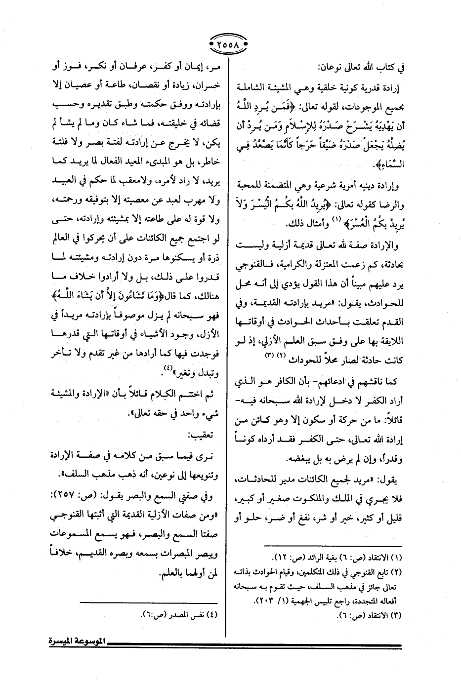يقول: "مريد لجميع الكائنات مدير للحادثات، فلا يجري في الملك والملكوت صغير أو كبير، قليل أو كثير، خير أو شر، نفع أو ضر، حلو أو مر، إيمان أو كفر، عرفان أو نكر، فوز أو خسران، زيادة أو نقصان، طاعة أو عصيان إلا بإرادته ووفق حكمته وطبق تقديره وحسب قضائه في خليقته، فما شاء كان وما لم يشأ لم يكن، لا يخرج عن إرادته لفتة بصر ولا فلتة خاطر، بل هو المبدئ المعيد الفعال لما يريد كما يريد، لا راد لأمره، ولا معقب لما حكم في العبيد ولا مهرب لعبد عن معصيته إلا بتوفيقه ورحمته، ولا قوة له على طاعته إلا بمشيئته وإرادته، حتى لو اجتمع جميع الكائنات على أن يحركوا في العالم ذرة أو يسكنوها مرة دون إرادته ومشيئته لما قدروا على ذلك، بل ولا أرادوا خلاف ما هنالك، كما قال {وَمَا تَشَاءُونَ إلا أَنْ يَشَاءَ اللَّهُ} فهو سبحانه لم يزل موصوفًا بإرادته مريدًا في الأزل، وجود الأشياء في أوقاتها التي قدرها فوجدت فيها كما أرادها من غير تقدم ولا تأخر وتبدل وتغير" (¬4).