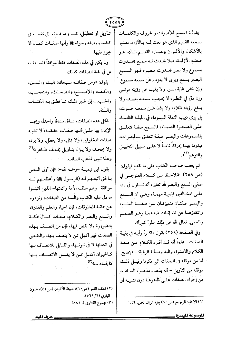 يقول ابن تيمية -رحمه الله-: "إن أولى الناس بالحق أتبعهم له (الرسول - صلى الله عليه وسلم -) وأعظمهم له موافقة - وهم سلف الأمة وأئمتها - الذين أثبتوا ما دل عليه الكتاب والسنة من الصفات، ونزهوه عن مماثلة المخلوقات، فإن الحياة والعلم والقدرة، والسمع والبصر والكلام، صفات كمال ممكنة بالضرورة ولا نقص فيها، فإن من اتصف بهذه الصفات فهو أكمل ممن لا يتصف بها، والنقص في انتفائها لا في ثبوتها، والقابل للاتصاف بها كالحيوان أكمل ممن لا يقبل الاتصاف بها كالجمادات" (¬3).