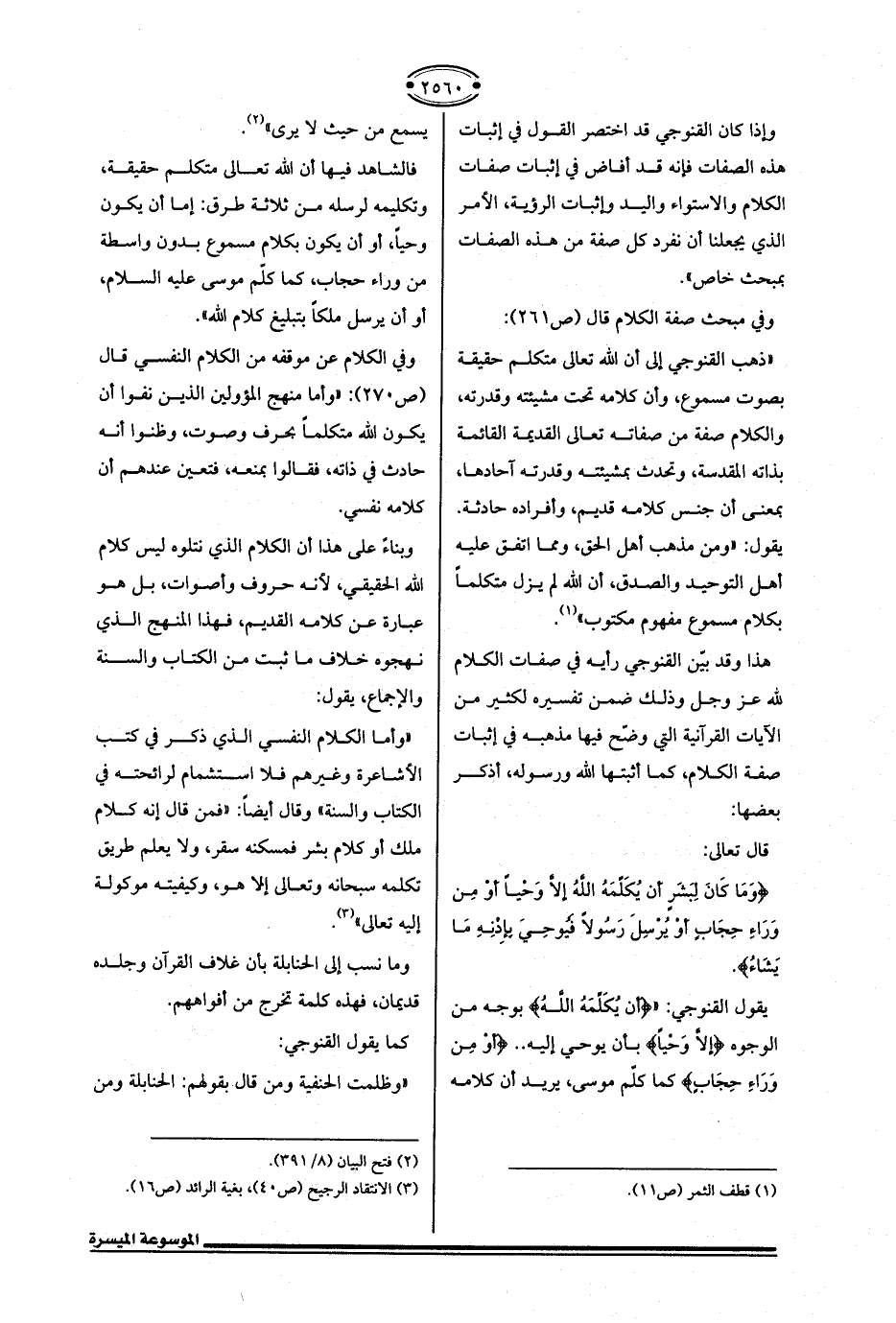 وفي مبحث صفة الكلام قال (ص 261): "ذهب القنوجي إلى أن الله تعالى متكلم حقيقة بصوت مسموع، وأن كلامه تحت مشيئته وقدرته، والكلام صفة من صفاته تعالى القديمة القائمة بذاته المقدسة، وتحدث بمشيئته وقدرته آحادها، بمعنى أن جنس كلامه قديم، وأفراده حادثة. يقول: "ومن مذهب أهل الحق، ومما اتفق عليه أهل التوحيد والصدق، أن الله لم يزل متكلمًا بكلام مسموع مفهوم مكتوب" (¬1).