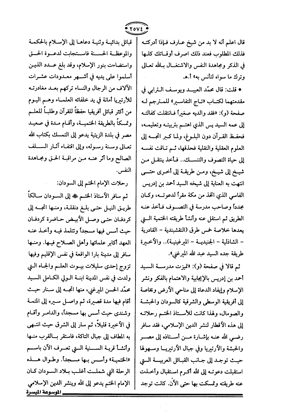 ثم قالا في صفحة (و): "تميزت مدرسة السيد أحمد بن إدريس بالإيجابية والاهتمام بالفكر ونشر الإسلام وإيفاد الدعاة إلى مناحي الأرض وبخاصة إلى أفريقية الوسطى والشرقية كالسودان والحبشة والصومال، ولهذا كانت للأستاذ الختم رحلاته إلى هذه الأقطار لنشر الدين الإسلامي، فقد سافر رضي الله عنه بإشارة من أستاذه إلى مصر والحبشة والأرتيريا وفي جبال الأرتيريا وسهولها حيث توجد إلى جانب القبائل العربية التي استقبلت دعوته إلى الله أكرم استقبال وأخذت عنه طريقته وتمسكت بها حتى الآن. كانت لوجد قبائل بدائية وثنية دعاها إلى الإسلام بالحكمة والموعظة الحسنة فاستجابت لدعوة الحق واستضاءت بنور الإسلام، وقد بلغ عدد الذين أسلموا على يديه في أشهر معدودات عشرات الآلاف من الرجال والنساء تركهم بعد مغادرته للأرتيريا أمانة في يد خلفائه العلماء وهم اليوم من أكثر قبائل أفريقيا حفظًا للقرآن وطلبًا للعلم وتمسكًا بالطريقة الختمية، وأقام مدة في صعيد مصر في بلدة الزيتية يدعو إلى التمسك بكتاب الله تعالى وسنة رسوله، وإلى اقتفاء آثار السلف الصالح وما أثر عنه من مراقبة الحق ومجاهدة النفس.
