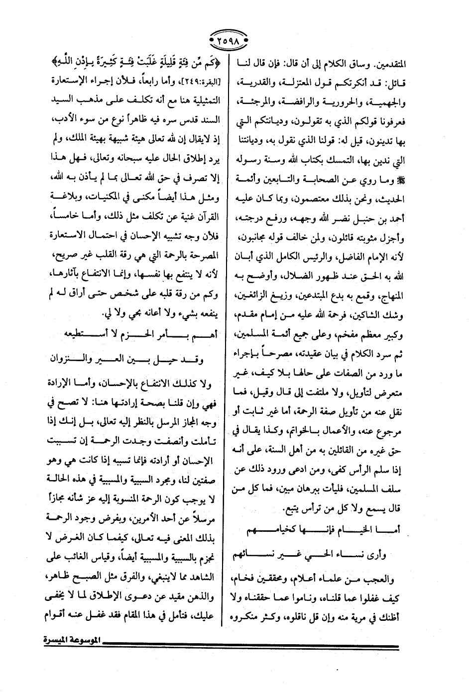 والعجب من علماء أعلام، ومحققين فخام، كيف غفلوا عما قلناه، وناموا عما حققناه ولا أظنك في مرية منه وإن قل ناقلوه، وكثر منكروه {كَمْ مِنْ فِئَةٍ قَلِيلَةٍ غَلَبَتْ فِئَةً كَثِيرَةً بِإِذْنِ اللَّهِ} [البقرة: 249]، وأمَّا رابعًا، فلأن إجراء الاستعارة التمثيلية هنا مع أنَّه تكلف على مذهب السيد السند قدس سره فيه ظاهرًا نوع من سوء الأدب، إذ لا يقال إن لله تعالى هيئة شبيهة بهيئة الملك، ولم يرد إطلاق الحال عليه سبحانه وتعالى، فهل هذا إلَّا تصرف في حق الله تعالى بما لم يأذن به الله، ومثل هذا أيضًا مكنى في المكنيات، وبلاغة القرآن غنية عن تكلف مثل ذلك، وأمَّا خامسًا، فلأن وجه تشبيه الإحسان في احتمال الاستعارة المصرحة بالرحمة التي هي رقة القلب غير صريح، لأنَّه لا ينتفع بها نفسها، وإنما الانتفاع بآثارها، وكم من رقة قلبه على شخص حتَّى أراق له لم ينفعه بشيء ولا أعانه بحي ولا لي.