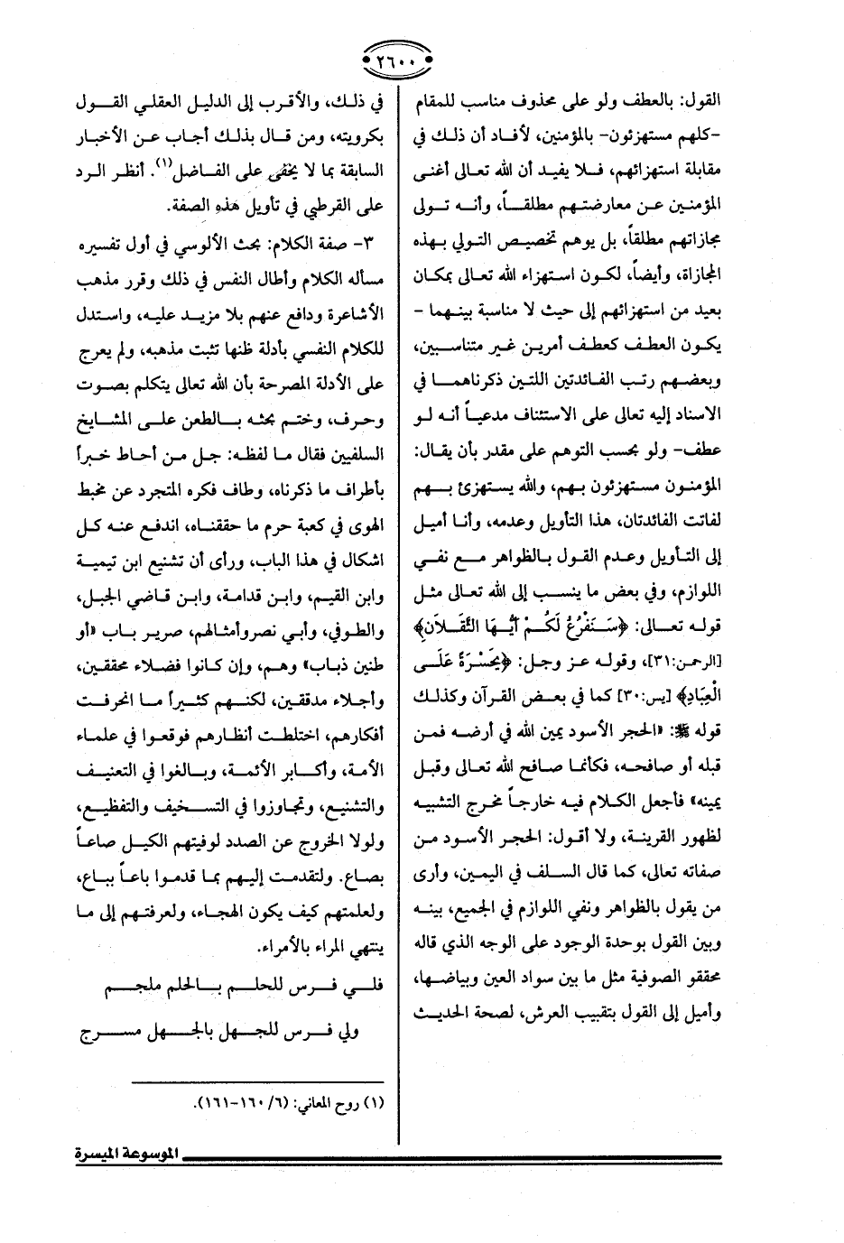 3 - صفة الكلام: بحث الألوسي في أول تفسيره مسألة الكلام وأطال النَّفس في ذلك وقرر مذهب الأشاعرة ودافع عنهم بلا مزيد عليه، واستدل للكلام النفسي بأدلة ظنها تثبت مذهبه، ولم يعرج على الأدلة المصرحة بأن الله تعالى يتكلم بصوت وحرف، وختم بحثه بالطعن علي المشايخ السلفيين فقال ما لفظه: جل من أحاط خبرًا بأطراف ما ذكرناه، وطاف فكره المتجرد عن مخبط الهوى في كعبة حرم ما حققناه، اندفع عنه كل اشكال في هذا الباب، ورأى أن تشنيع ابن تيمية وابن القيِّم، وابن قدامة، وابن قاضي الجبل، والطوفي، وأبي نصر وأمثالهم، صرير باب "أو طنين ذباب" وهم، وإن كانوا فضلاء محققين، وأجلاء مدققين، لكنهم كثيرًا ما انحرفت أفكارهم، اختلطت أنظارهم فوقعوا في علماء الأمة، وأكابر الأئمة، وبالغوا في التعنيف والتشنيع، وتجاوزوا في التسخيف والتفظيع، ولولا الخروج عن الصدد لوفيتهم الكيل صاعًا بصاع. ولتقدمت إليهم بما قدموا باعًا بباع، ولعلمتهم كيف يكون الهجاء، ولعرفتهم إلى ما ينتهي المراء بالأمراء.