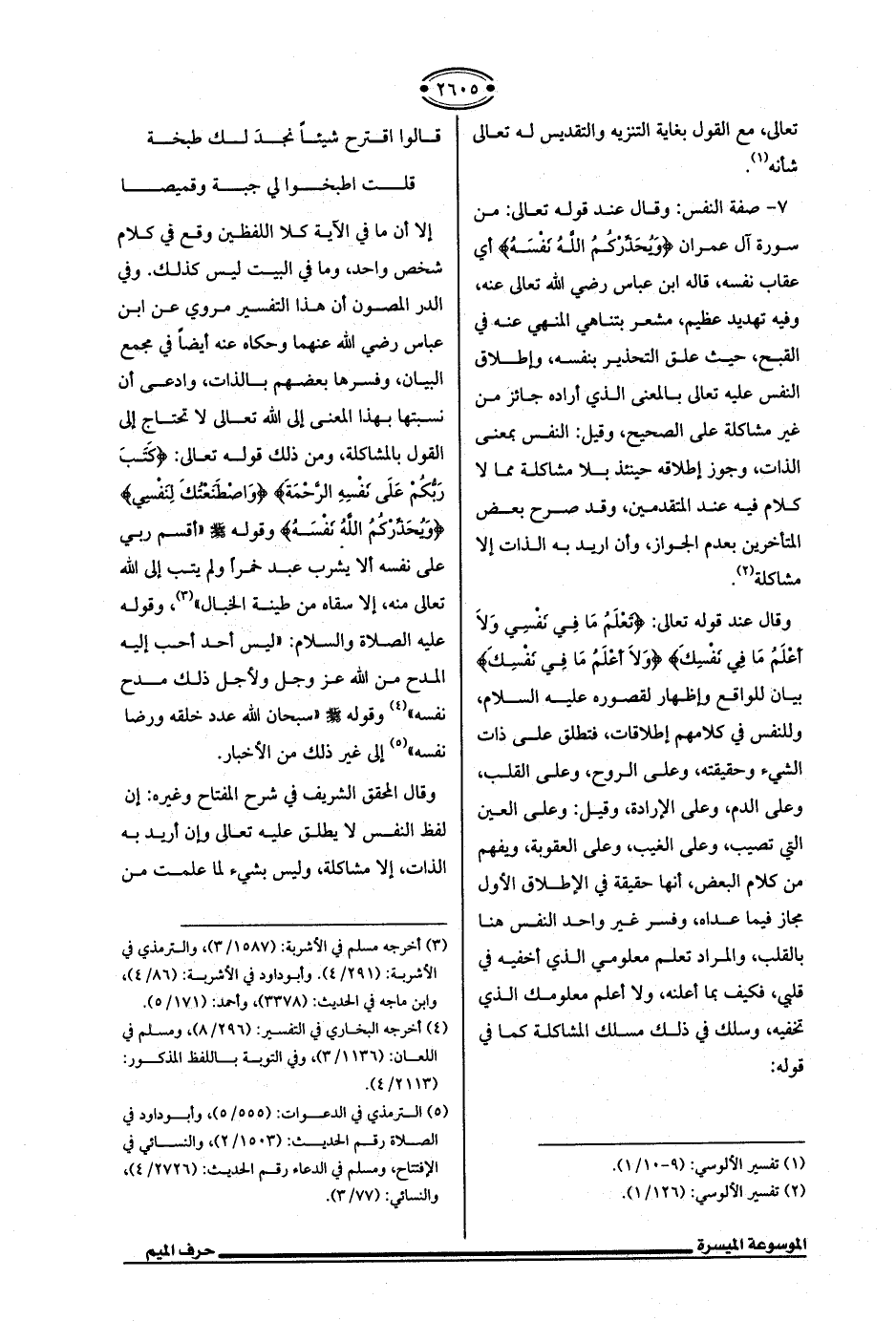 7 - صفة النَّفس: وقال عند قوله تعالى: من سورة آل عمران {وَيُحَذِّرُكُمُ اللَّهُ نَفْسَهُ} أي عقاب نفسه، قاله ابن عباس رضي الله تعالى عنه، وفيه تهديد عظيم، مشعر بتناهي المنهي عنه في القبح، حيث علق التحذير بنفسه، وإطلاق النَّفس عليه تعالى بالمعنى الذي أراده جائز من غير مشاكلة على الصَّحيح، وقيل: النَّفس بمعنى الذّات، وجوز إطلاقه حينئذ بلا مشاكلة مما لا كلام فيه عند المتقدمين، وقد صرح بعض المتأخرين بعدم الجواز، وأن أُريد به الذّات إلَّا مشاكلة (¬2).