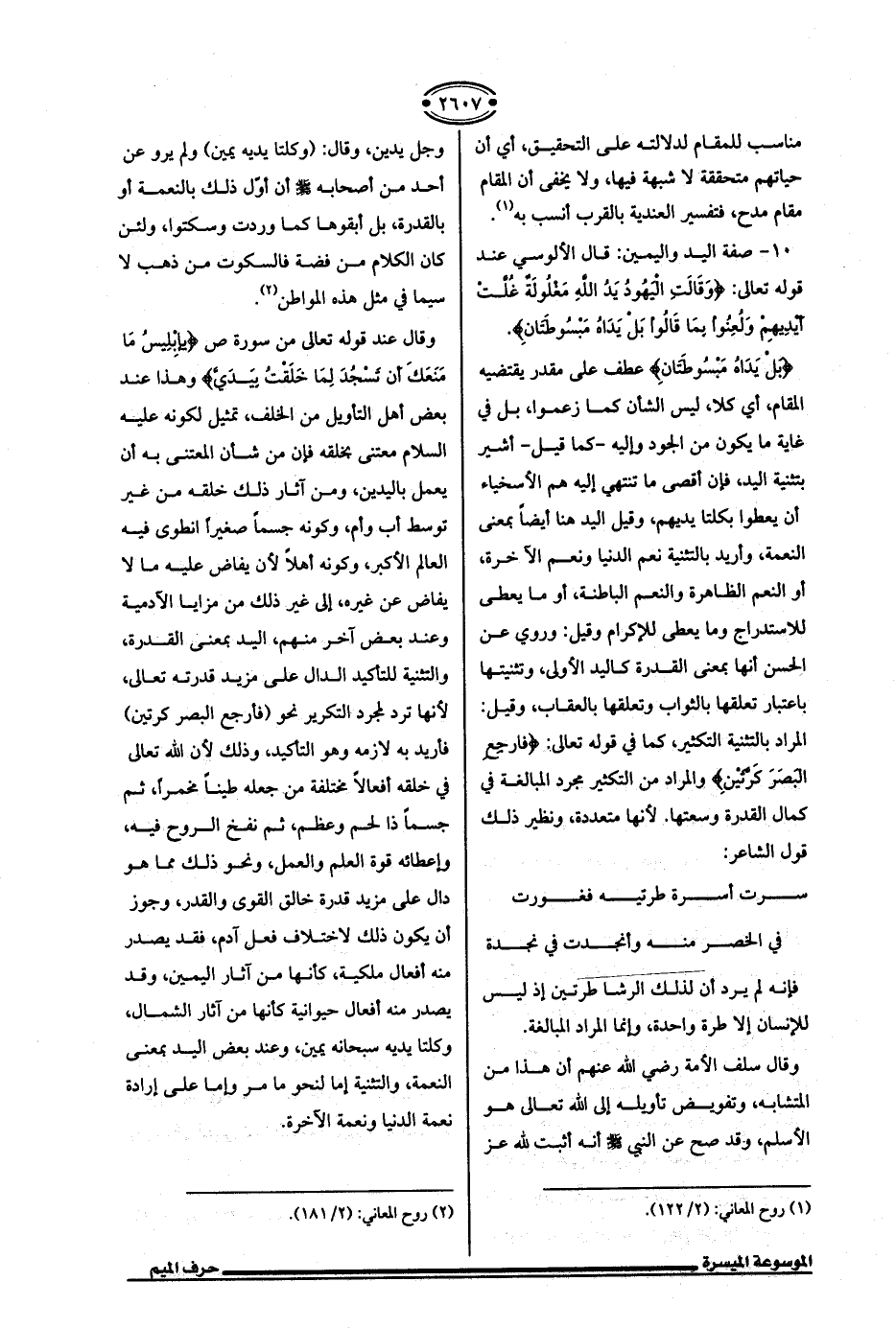 10 - صفة اليد واليمين: قال الألوسي عند قوله تعالى: {وَقَالتِ الْيَهُودُ يَدُ اللَّهِ مَغْلُولَةٌ غُلَّتْ أَيدِيهِمْ وَلُعِنُوا بِمَا قَالُوا بَلْ يَدَاهُ مَبْسُوطَتَانِ}.