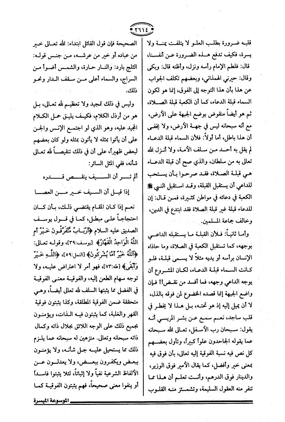 وأمَّا ثانيًا: فلأن القبلة ما يستقبله الداعي بوجهه، كما تستقبل الكعبة في الصَّلاة، وما حاذاه الإنسان برأسه أو يديه مثلًا لا يسمى قبلة، فلو كانت السماء قبلة الدعاء، لكان المشروع أن يوجه الداعي وجهه، فما أفسد من نقض! ! فإن واضع الجبهة إنَّما قصده الخضوع لمن فوقه بالذل، لا أن يميل إليه إذ هو تحته، بل هذا لا يخطر في قلب ساجد، نعم سمع عن بشر المريسي أنَّه يقول: سبحان رب الأسفل، تعالى الله سبحانه عما يقول الجاحدون علوًا كبيرًا، وتأول بعضهم كل نص فيه نسبة الفوقية إليه تعالى، بأن فوق فيه بمعنى خير وأفضل، كما يقال الأمير فوق الوزير، والدينار فوق الدرهم، وأنت تعلم أن هذا مما تنفر منه العقول السليمة، وتشمئز منه القلوب الصحيحة فإن قول القائل ابتداء: الله تعالى خير من عباده أو خير من عرشه، من جنس قوله: الثلج بارد: والنَّار حارة، والشمس أضوأ من السَّرَّاج، والسماء أعلى من سقف الدار ونحو ذلك.