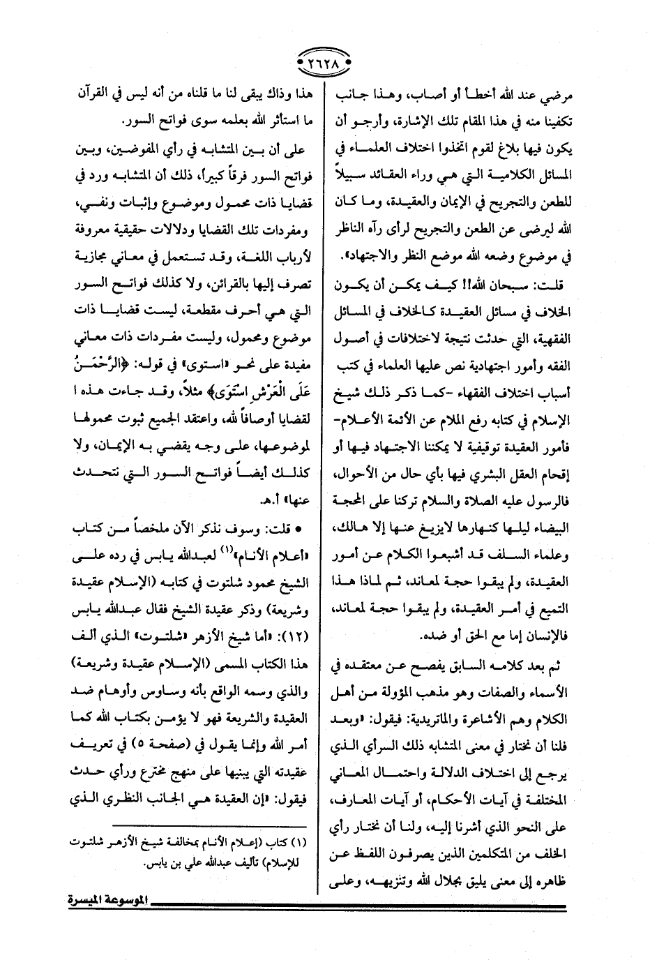 * قلت: وسوف نذكر الآن ملخصًا من كتاب "أعلام الأنام" (¬1) لعبد الله يابس في رده على الشَّيخ محمود شلتوت في كتابه "الإسلام عقيدة وشريعة" وذكر عقيدة الشَّيخ فقال عبد الله يابس (12): "أما شيخ الأزهر "شلتوت" الذي ألف هذا الكتاب المسمى (الإسلام عقيدة وشريعة) والذي وسمه الواقع بأنه وساوس وأوهام ضد العقيدة والشريعة فهو لا يؤمن بكتاب الله كما أمر الله وإنَّما يقول في (صفحة 5) في تعريف عقيدته التي يبنيها على منهج مخترع ورأي حدث فيقول: "إن العقيدة هي الجانب النظري الذي