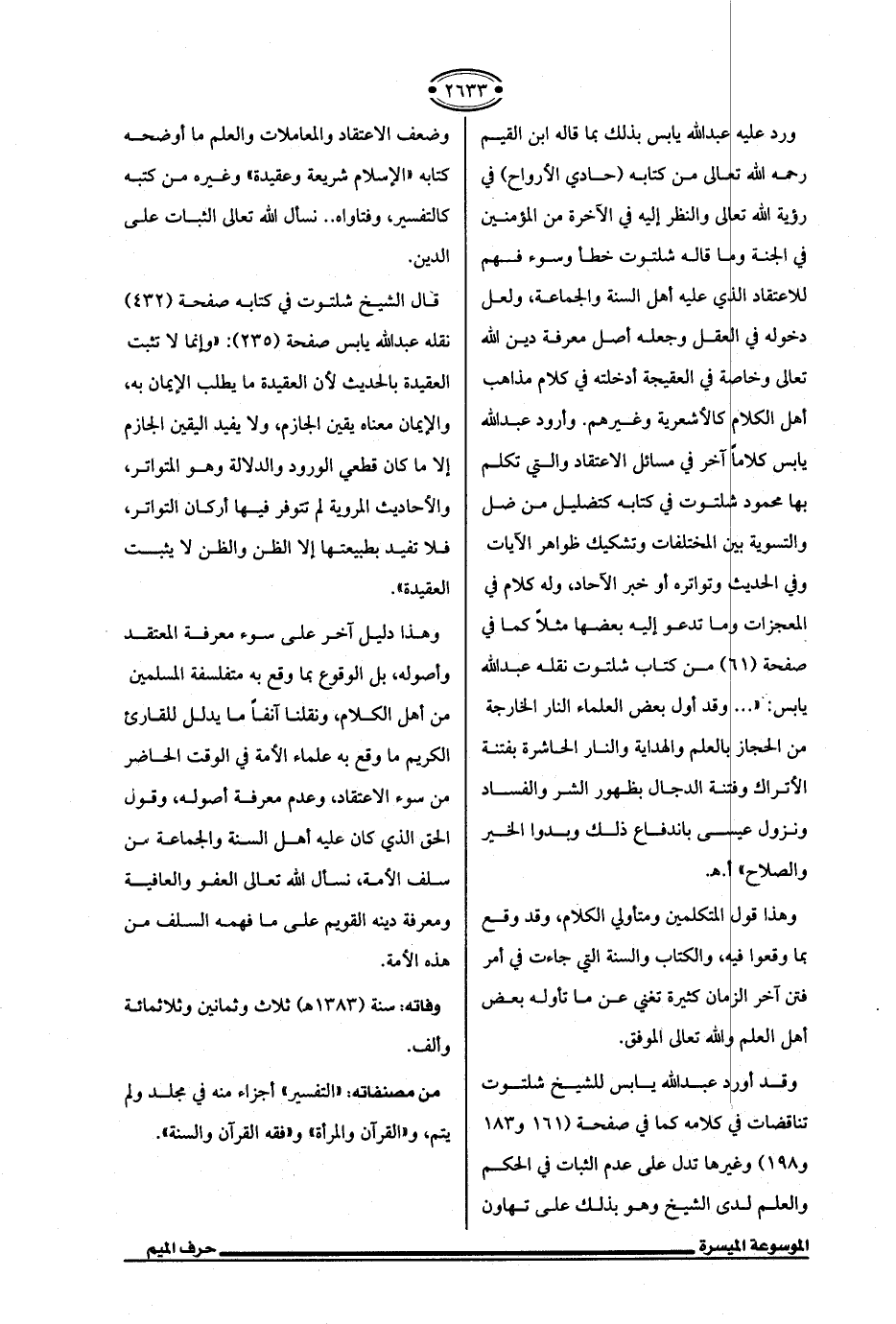 ورد عليه عبد الله يابس بذلك بما قاله ابن القيِّم رحمه الله تعالى من كتابه (حادي الأرواح) في رؤية الله تعالى والنظر إليه في الآخرة من المؤمنين في الجنَّة وما قاله شلتوت خطأ وسوء فهم للاعتقاد الذي عليه أهل السنة والجماعة، ولعل دخوله في العقل وجعله أصل معرفة دين الله تعالى وخاصة في العقيجة أدخلته في كلام مذاهب أهل الكلام كالأشعرية وغيرهم. وأرود عبد الله يابس كلامًا آخر في مسائل الاعتقاد والتي تكلم بها محمود شلتوت في كتابه كتضليل من ضل والتسوية بين المختلفات وتشكيك ظواهر الآيات وفي الحديث وتواتره أو خبر الآحاد، وله كلام في المعجزات وما تدعو إليه بعضها مثلًا كما في صفحة (61) من كتاب شلتوت نقله عبد الله يابس: " ... وقد أول بعض العلماء النَّار الخارجة من الحجاز بالعلم والهداية والنَّار الحاشرة بفتنة الأتراك وفتنة الدجال بظهور الشر والفساد ونزول عيسى باندفاع ذلك وبدوا الخير والصلاح" أ. هـ.