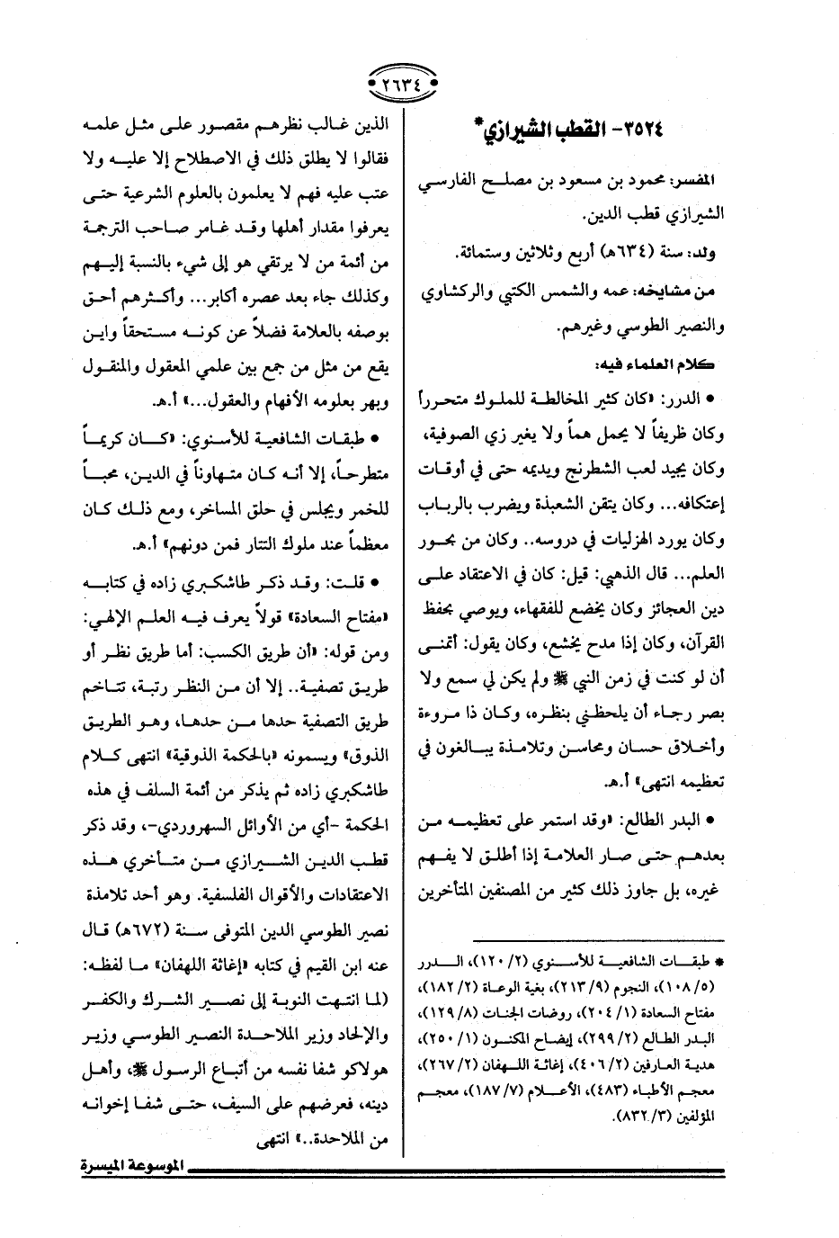 * قلت: وقد ذكر طاشكبري زاده في كتابه "مفتاح السعادة" قولًا يعرف فيه العلم الإلهي: ومن قوله: "أن طريق الكسب: أما طريق نظر أو طريق تصفية .. إلَّا أن من النظر رتبة، تتاخم طريق التصفية حدها من حدها، وهو الطَّريق الذوق" ويسمونه "بالحكمة الذوقية" انتهى كلام طاشكبري زاده ثم يذكر من أئمة السلف في هذه الحكمة -أي من الأوائل السهروردي-، وقد ذكر قطب الدين الشيرازي من متأخري هذه الاعتقادات والأقوال الفلسفية. وهو أحد تلامذة نصير الطُّوسي الدين المتوفى سنة (672 هـ) قال عنه ابن القيِّم في كتابه "إغاثة اللهفان" ما لفظه: (لما انتهت النوبة إلى نصير الشرك والكفر والإلحاد وزير الملاحدة النصير الطُّوسي وزير هولاكو شفا نفسه من أتباع الرسول - صلى الله عليه وسلم -، وأهل دينه، فعرضهم على السيف، حتَّى شفا إخوانه من الملاحدة .. " انتهى.