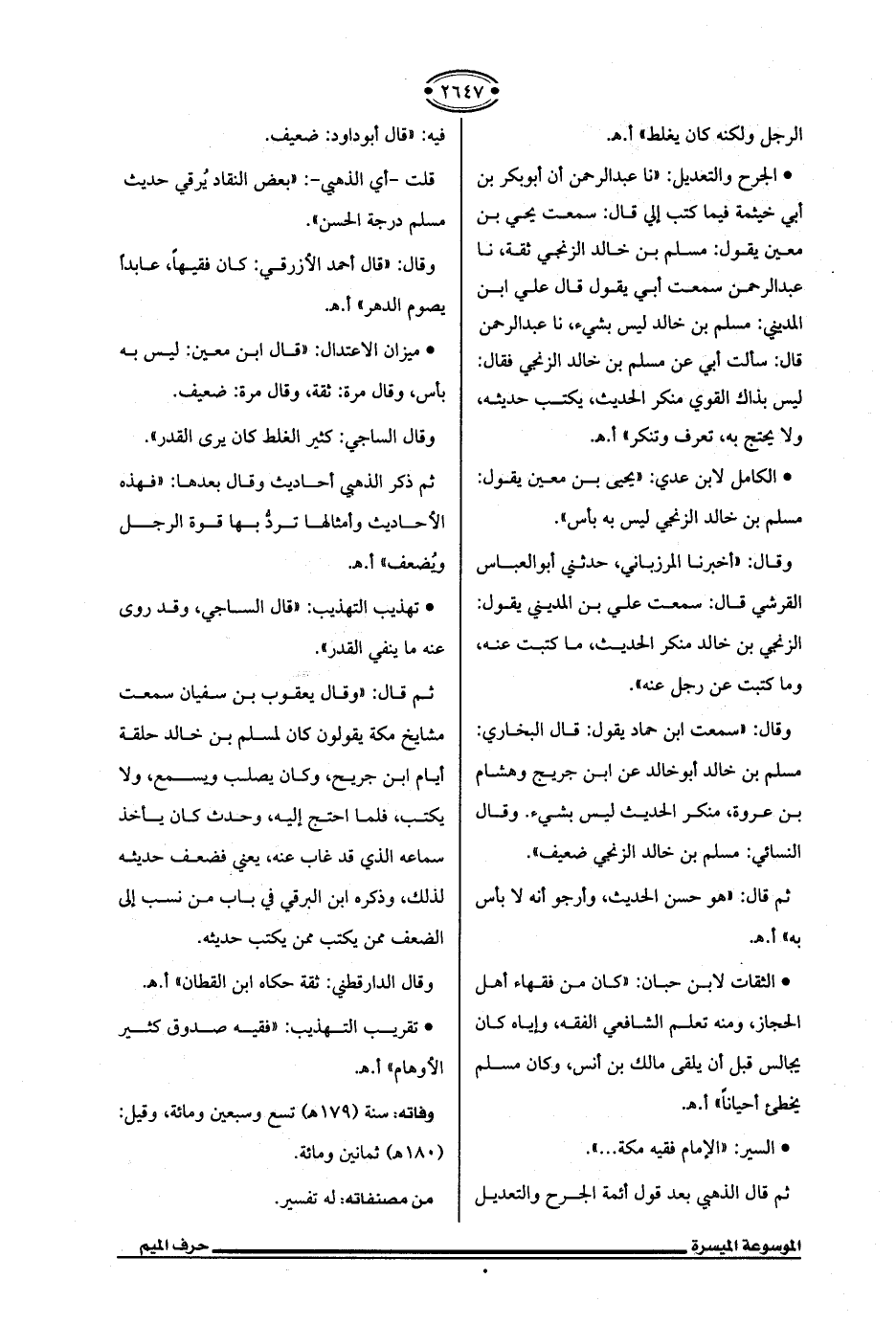 • الكامل لابن عدي: "يحيى بن معين يقول: مسلم بن خالد الزنجي ليس به بأس".