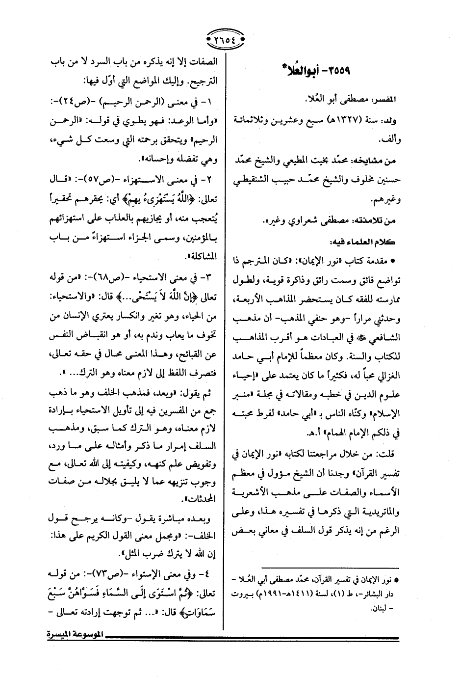 * نور الإيمان في تفسير القرآن، محمّد مصطفى أبي العُلا- دار البشائر-، ط (1)، لسنة (1411 هـ -1991 م) بيروت - لبنان.