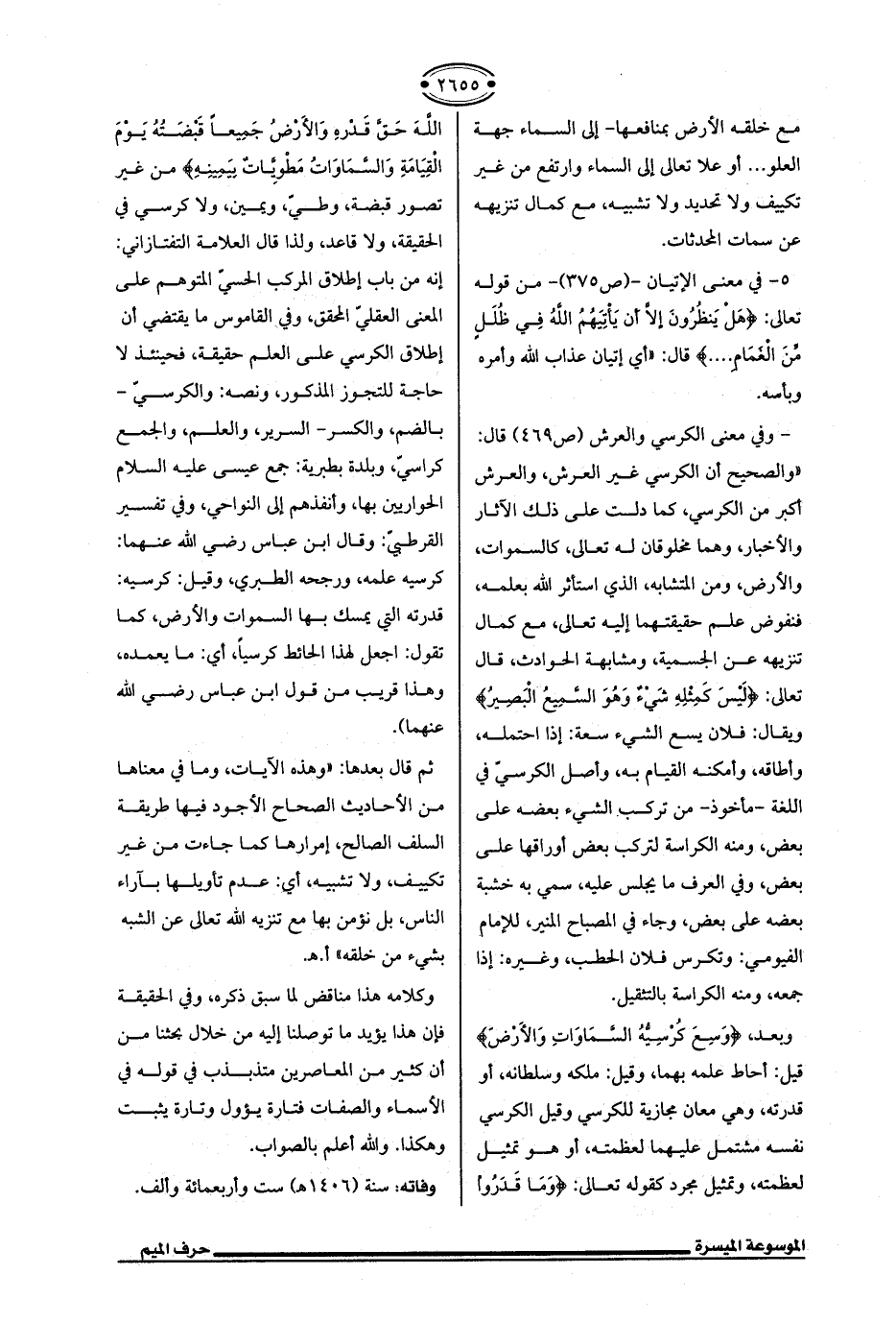 - وفي معنى الكرسي والعرش (ص 469) قال: "والصحيح أن الكرسي غير العرش، والعرش أكبر من الكرسي، كما دلت على ذلك الآثار والأخبار، وهما مخلوقان له تعالى، كالسموات، والأرض، ومن المتشابه، الذي استأثر الله بعلمه، فنفوض علم حقيقتهما إليه تعالى، مع كمال تنزيهه عن الجسمية، ومشابهة الحوادث، قال تعالى: {لَيسَ كَمِثْلِهِ شَيءٌ وَهُوَ السَّمِيعُ الْبَصِيرُ} ويقال: فلان يسع الشيء سعة: إذا احتمله، وأطاقه، وأمكنه القيام به، وأصل الكرسي في اللغة -مأخوذ- من تركب الشيء بعضه على بعض، ومنه الكراسة لتركب بعض أوراقها على بعض، وفي العرف ما يجلس عليه، سمي به خشبة بعضه على بعض، وجاء في المصباح المنير، للإمام الفيومي: وتكرس فلان الحطب، وغيره: إذا جمعه، ومنه الكراسة بالتثقيل.