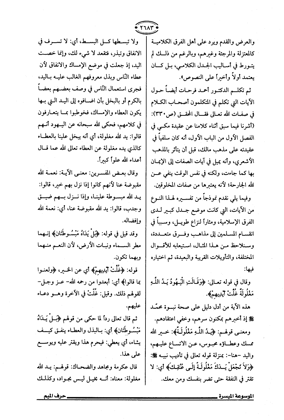 ومعنى قولهم: {يَدُ اللَّهِ مَغْلُولَةٌ}: خير الله ممسك وعطاؤه محبوس، عن الاتساع عليهم، واليد -هنا-: بمنزلة قوله تعالى في تأديب نبيه - صلى الله عليه وسلم -: {وَلَا تَجْعَلْ يَدَكَ مَغْلُولَةً إِلَى عُنُقِكَ} أي: لا تقتر في النفقة حتى تضر بنفسك ومن معك.