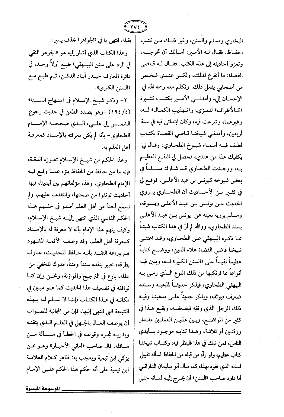 وهذا الحكم من شيخ الإِسلام تعوزه الدقة، فإنه ما من حافظ من الحفاظ ينزه عما وقع فيه الإِمام الطحاوي، وهذه مؤلفاتهم بين أيدينا، فيها أحاديث توثقوا من صحتها، وانتقدت عليهم، ولم نسمع أحدًا من أهل العلم أصدر في حقهم هذا الحكم القاسي الذي انتهى إليه شيخ الإِسلام، وكيف يتهم هذا الإِمام بأنه لا معرفة له بالإسناد كمعرفة أهل العلم، وقد وصفه الأئمة المشهود لهم ببراعة النقد بأنه حافظ للحديث، عارف بطرقه، خبير بنقده سندًا ومتنًا، مدرك للخفي من علله، بارع في الترجيح والموازنة، ونحن وإن كنا نوافقه في تضعيف هذا الحديث كما هو مبين في مكانه في هذا الكتاب فإننا لا نسلم له بهذه النتيجة التي انتهى إليها، فإن من المجانبة للصواب أن يوصف العالم بالجهل في العلم الذي يتقنه ويدريه لمجرد وقوعه في الخطأ في مسألة من مسائله. قال صاحب "أماني الأحبار" وهو ممن يزكي ابن تيمية ويعجب به: ظاهر كلام العلامة ابن تيمية على أنه حكم هذا الحكم على الإِمام