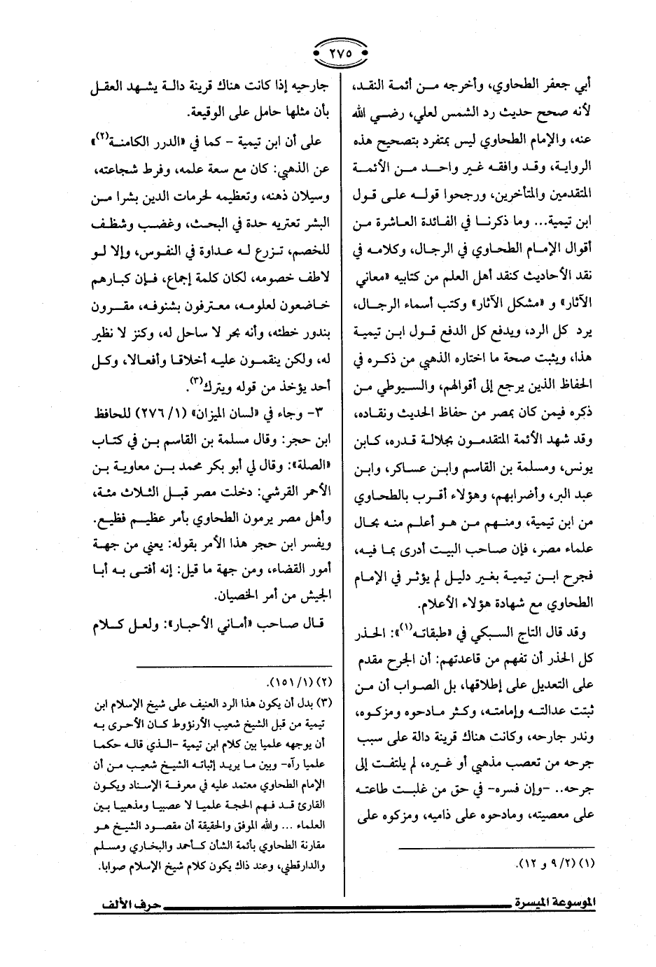 (¬3) بدل أن يكون هذا الرد العنيف على شيخ الإِسلام ابن تيمية من قبل الشيخ شعيب الأرنؤوط كان الأحرى به أن يوجهه علميا بين كلام ابن تيمية -الذي قاله حكما علميا رآه- وبين ما يريد إثباته الشيخ شعيب من أن الإمام الطحاوي معتمد عليه في معرفة الإسناد ويكون القارئ قد فهم الحجة علميا لا عصبيا ومذهبيا بين العلماء ... والله الموفق والحقيفة أن مقصود الشيخ هو مقارنة الطحاوي بأئمة الشأن كأحمد والبخاري ومسلم والدارقطني، وعند ذاك يكون كلام شيخ الإِسلام صوابا.