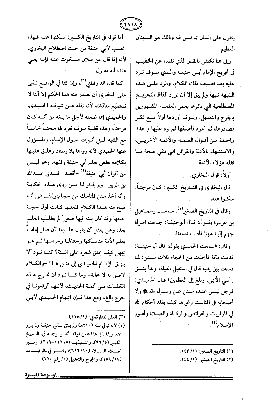 أما قوله في التاريخ الكبير: سكتوا عنه فهذه تحسب لأبي حنيفة من حيث اصطلاح البخاري، لأنه إذا قال عن فلان مسكوت عنه فإنه يعني عنده أنه مقبول.