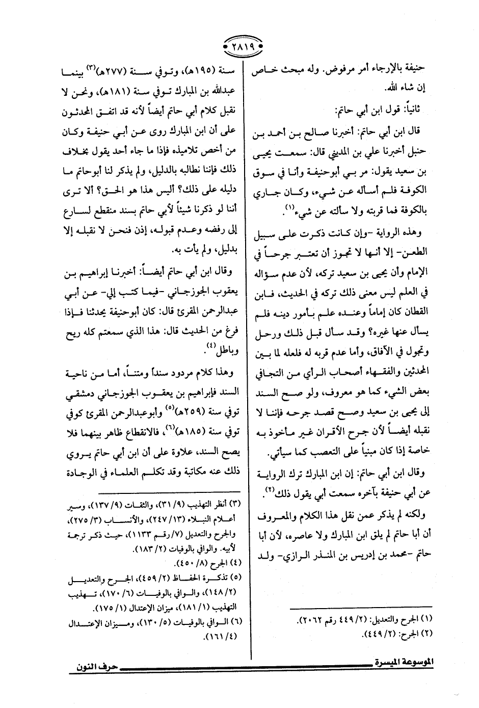ولكنه لم يذكر عمن نقل هذا الكلام والمعروف أن أبا حاتم لم يلق ابن المبارك ولا عاصره, لأن أبا حاتم -محمد بن إدريس بن المنذر الرازي- ولد سنة (195 هـ)، وتوفي سنة (277 هـ) (¬3) بينما عبد الله بن المبارك توفي سنة (181 هـ)، ونحن لا نقبل كلام أبي حاتم أيضًا لأنه قد اتفق المحدثون على أن ابن المبارك روى عن أبي حنيفة وكان من أخص تلاميذه فهذا ما جاء أحد يقول بخلاف ذلك فإننا نطالبه بالدليل، ولم يذكر لنا أبو حاتم ما دليله على ذلك؟ أليس هذا هو الحق؟ ألا ترى أننا لو ذكرنا شيئًا لأبي حاتم بسند منقطع لسارع إلى رفضه وعدم قبوله، إذن فنحن لا نقبله إلا بدليل، ولم يأت به.