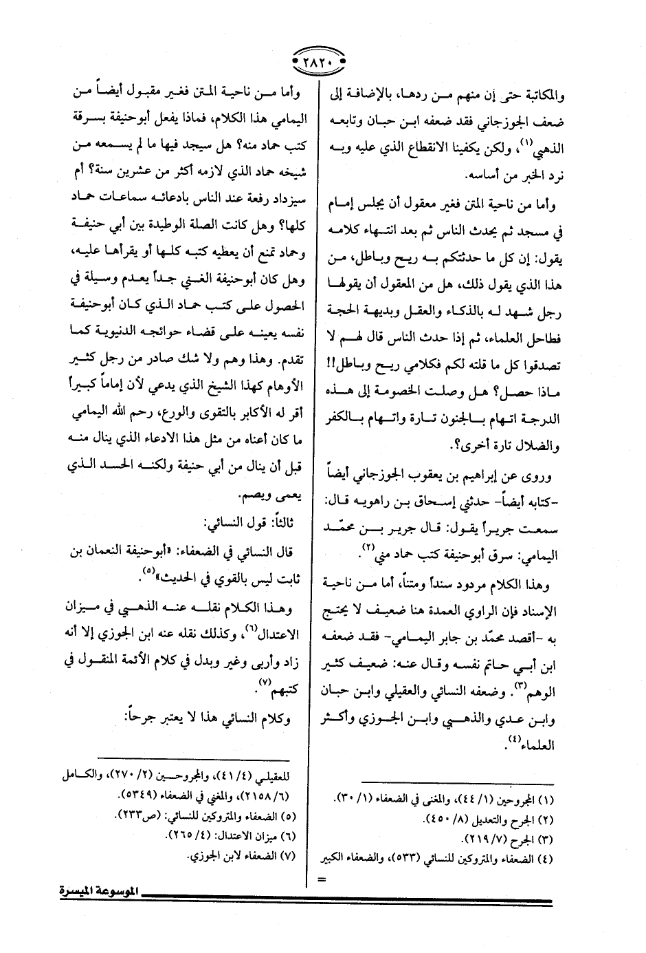 قال النسائي في الضعفاء: "أبو حنيفة النعمان بن ثابت ليس بالقوي في الحديث" (¬5).
