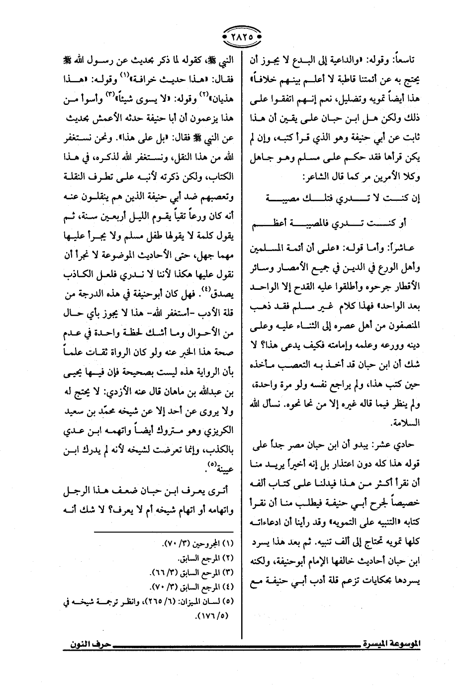 حادي عشر: يبدو أن ابن حبان مصر جدًّا على قوله هذا كله دون اعتذار بل إنه أخيرًا يريد منا أن نقرأ أكثر من هذا فيدلنا على كتاب ألفه خصيصًا لجرح أبي حنيفة فيطلب منا أن نقرأ كتابه "التنبيه على التمويه" وقد رأينا أن ادعاءاته كلها تمويه تحتاج إلى ألف تنبيه. ثم بعد هذا يسرد ابن حبان أحاديث خالفها الإمام أبو حنيفة، ولكنه يسردها بحكايات تزعم قلة أدب أبي حنيفة مع النبي - صلى الله عليه وسلم -، كقوله لما ذكر حديث عن رسول الله - صلى الله عليه وسلم - فقال: "هذا حديث خرافة" (¬1) وقوله: "هذا هذيان" (¬2) وقوله: "لا يسوى شيئًا" (¬3) وأسوأ من هذا يزعمون أن أبا حنيفة حدثه الأعمش بحديث عن النبي - صلى الله عليه وسلم - فقال: "بل على هذا". ونحن نستغفر الله من هذا النقل، ونستغفر الله لذكره، في هذا الكتاب، ولكن ذكرته لأنبه على تطرف النقلة وتعصبهم ضد أبي حنيفة الذين هم ينقلون عنه أنه كان ورعًا تقيًّا يقوم الليل أربعين سنة، ثم يقول كلمة لا يقولها طفل مسلم ولا يجرأ عليها مهما جهل، حتى الأحاديث الموضوعة لا نجرأ أن نقول عليها هكذا لأننا لا ندري فلعل الكاذب يصدق (¬4). فهل كان أبو حنيفة في هذه الدرجة من قلة الأدب -أستغفر الله- هذا لا يجوز بأي حال من الأحوال وما أشك لحظة واحدة في عدم صحة هذا الخبر عنه ولو كان الرواة ثقات علمًا بأن الرواية هذه ليست بصحيحة فإن فيها يحيى بن عبد الله بن ماهان قال عنه الأزدي: لا يحتج له ولا يروى عن أحد إلا عن شيخه محمّد بن سعيد الكريزي وهو متروك أيضًا واتهمه ابن عدي بالكذب، وإنما تعرضت لشيخه لأنه لم يدرك ابن عيينة (¬5).