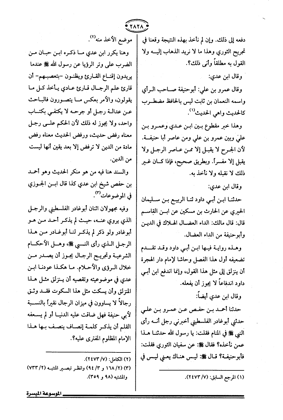 وهذا خبر مقطوع بين ابن عدي وعمرو بن علي وبين عمرو بن علي ومن عاصر أبا حنيفة. لأن الجرح لا يقبل إلا ممن عاصر الرجل ولا يقبل إلا مفسرًا. وبطريق صحيح، فإذا كان غير ذلك لا نقبله ولا نأخذ به.