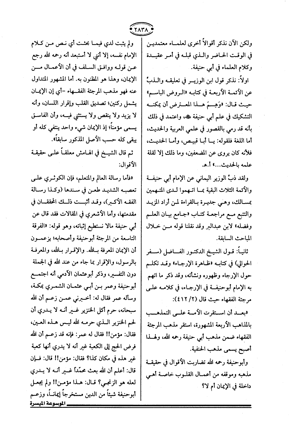 "فأما رسالة العالم والمتعلم، فإن الكوثري على تعصبه الشديد طعن في سندها (وكذا رسالة الفقه الأكبر)، وقد أثبت ذلك المحققان في مقدمتها، وأما الأشعري في المقالات فقد قال عن أبي حنيفة ما لا نستطيع إثباته، وهو قوله: "الفرقة التاسعة من المرجئة أبو حنيفة وأصحابه؛ يزعمون أن الإيمان المعرفة بالله. والإقرار بالله، والمعرفة بالرسول، والإقرار بما جاء من عند الله في الجملة دون التفسير، وذكر أبو عثمان الآدمي أنه اجتمع أبو حنيفة وعمر بن أبي عثمان الشمري بمكة، وسأله عمر فقال له: أخبرني عمن زعم أن الله سبحانه، حرم أكل الخنزير غير أنه لا يدري أن لحم الخنزير الذي حرمه الله ليس هذه العين، فقال: مؤمن! ! فقال له عمر: فإنه قد زعم أن الله فرض الحج إلى الكعبة غير أنه لا يدري أنها كعبة غير هذه في مكان كذا؟ فقال: مؤمن! ! قال: فإن قال: أعلم أن الله بعث محمّدًا غير أنه لا يدري لعله هو الزنجي؟ قال: هذا مؤمن! ! ولم يجعل أبو حنيفة شيئًا من الدين مستخرجًا إيمانًا، وزعم