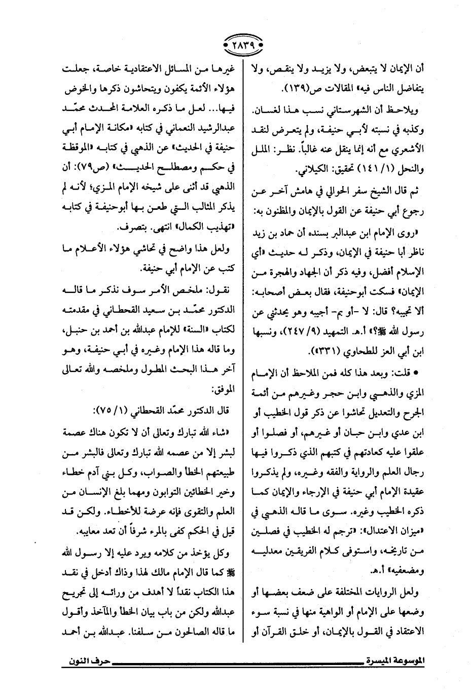 ثم قال الشيخ سفر الحوالي في هامش آخر عن رجوع أبي حنيفة عن القول بالإيمان والمظنون به: