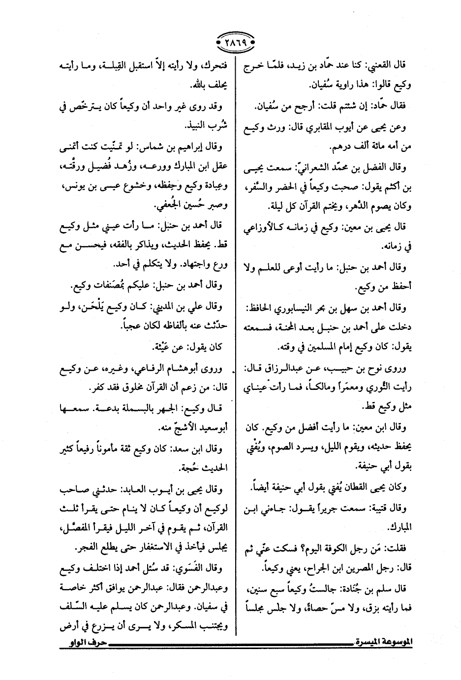 قال يحيى بن معين: وكيع في زمانه كالأوزاعي في زمانه.