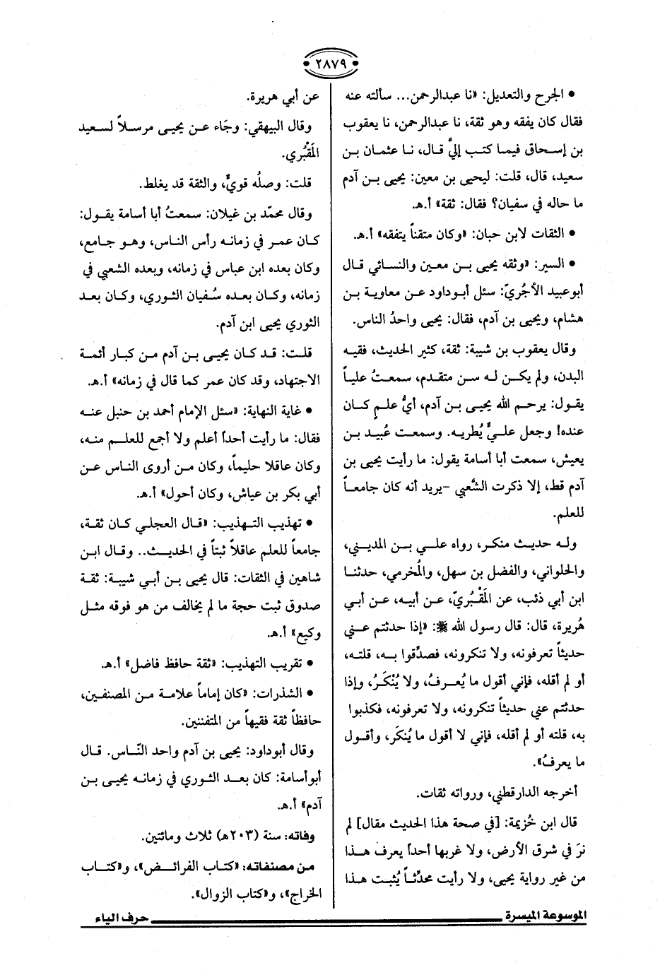 * السير: "وثقه يحيى بن معين والنسائي قال أبو عبيد الأجُريّ: سئل أبو داود عن معاوية بن هشام، ويحيى بن آدم، فقال: يحيى واحدُ الناس.