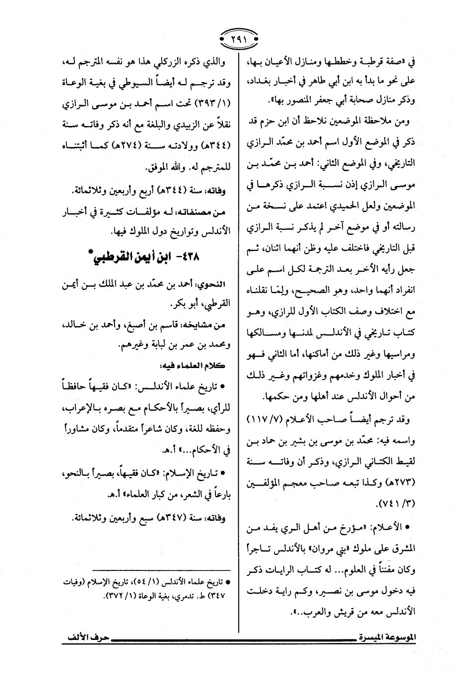 ومن ملاحظة الموضعين نلاحظ أن ابن حزم قد ذكر في الموضع الأول اسم أحمد بن محمّد الرازي التاريخي، وفي الموضع الثاني: أحمد بن محمّد بن موسى الرازي إذن نسبة الرازي ذكرها في الموضعين ولعل الحميدي اعتمد على نسخة من رسالته أو في موضع آخر لم يذكر نسبة الرازي قبل التاريخي فاختلف عليه وظن أنهما اثنان، ثم جعل رأيه الآخر بعد الترجمة لكل اسم على انفراد أنهما واحد، وهو الصحيح، ولِمَا نقلناه مع اختلاف وصف الكتاب الأول للرازي، وهو كتاب تاريخي في الأندلس لمدنها ومسالكها ومراسيها وغير ذلك من أماكنها، أما الثاني فهو في أخبار الملوك وخدمهم وغزواتهم وغير ذلك من أحوال الأندلس عند أهلها ومن حكمها.