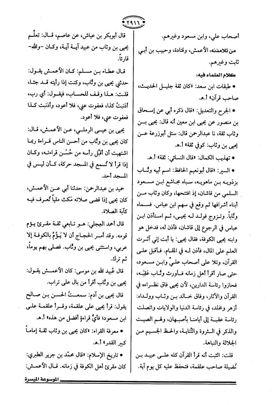 • معرفة القراء: "كان يحيى بن وثاب ثقة إمامًا كبير القدر" أ. هـ.