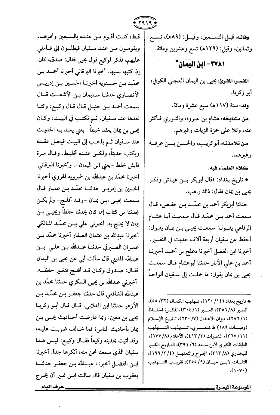 حدثنا أبو بكر أحمد بن محمد بن حفص، قال سمعت أحمد بن محمد قال سمعت أبا هشام الرفاعي يقول: سمعت يحيى بن يمان يقول: أحفظ عن سفيان أربعة آلاف حديث في التفسير. أخبرنا ابن الفضل أخبرنا دعلج بن أحمد أخبرنا أحمد بن علي الأبار حدثنا أبو هشام قال سمعت يحيى بن يمان يقول: ما حملت إلى سفيان ألواحًا قط، كنت أقوم من عنده بالسبعين ونحوها، ويقومون من عند سفيان فيطلبون إلي فأملي عليهم، فذكر لوكيع قول يحيى فقال: صدق، كان إذا كتبها نسيها. أخبرنا البرقاني أخبرنا أحمد بن محمّد بن حسنويه أخبرنا الحسين بن إدريس الأنصاري حدثنا سليمان بن الأشعث قال سمعت أحمد بن حنبل قال قال وكيع: وكنا نعدها عند سفيان، ثم نكتب في البيت، وكان يحيى بن يمان يعقد خيطًا -يعني يعد به الحديث عند سفيان ثم يذهب إلى البيت فيحل عقدة ويكتب حديثًا، ولكن عنده تخليط. وقال مرة فأيش خلط -يعني ابن اليمان-. وأخبرنا البرقاني أخبرنا محمّد بن عبد الله بن خميرويه الهروي أخبرنا الحسين بن إدريس حدثنا محمّد بن عمار قال سمعت يحيى بن يمان -وقد أفلج- ولم يكن يحدثنا من كتاب إنما كان يحدثنا حفظًا ويحيى بن يمان لا يحتج به. أخبرني علي بن محمّد المالكي أخبرنا عبد الله بن عثمان الصفار أخبرنا محمّد بن عمران الصيرفي حدثنا عبد الله بن علي بن عبد الله المدني قال سألت أبي عن يحيى بن اليمان فقال: صدوق وكان قد أفلج فتغير حفظه. أخبرني عبد الله بن يحيى السكري حدثنا محمّد بن عبد الله الشافعي قال حدثنا جعفر بن محمّد بن الأزهر حدثنا ابن الغلابي. قال قال أبو زكريا يحيى بن معين: ربما عارضت أحاديث يحيى بن يمان بأحاديث الناس؛ فما خالف ضربت عليه، وقد أتيت بحديثه وكيعًا فقال وكيع: ليس هذا سفيان الذي سمعنا نحن منه، أنكرها جدًّا. أخبرنا ابن الفضل أخبرنا عبد الله بن جعفر حدثنا يعقوب بن سفيان قال سألت ابن نمير أن يخرج