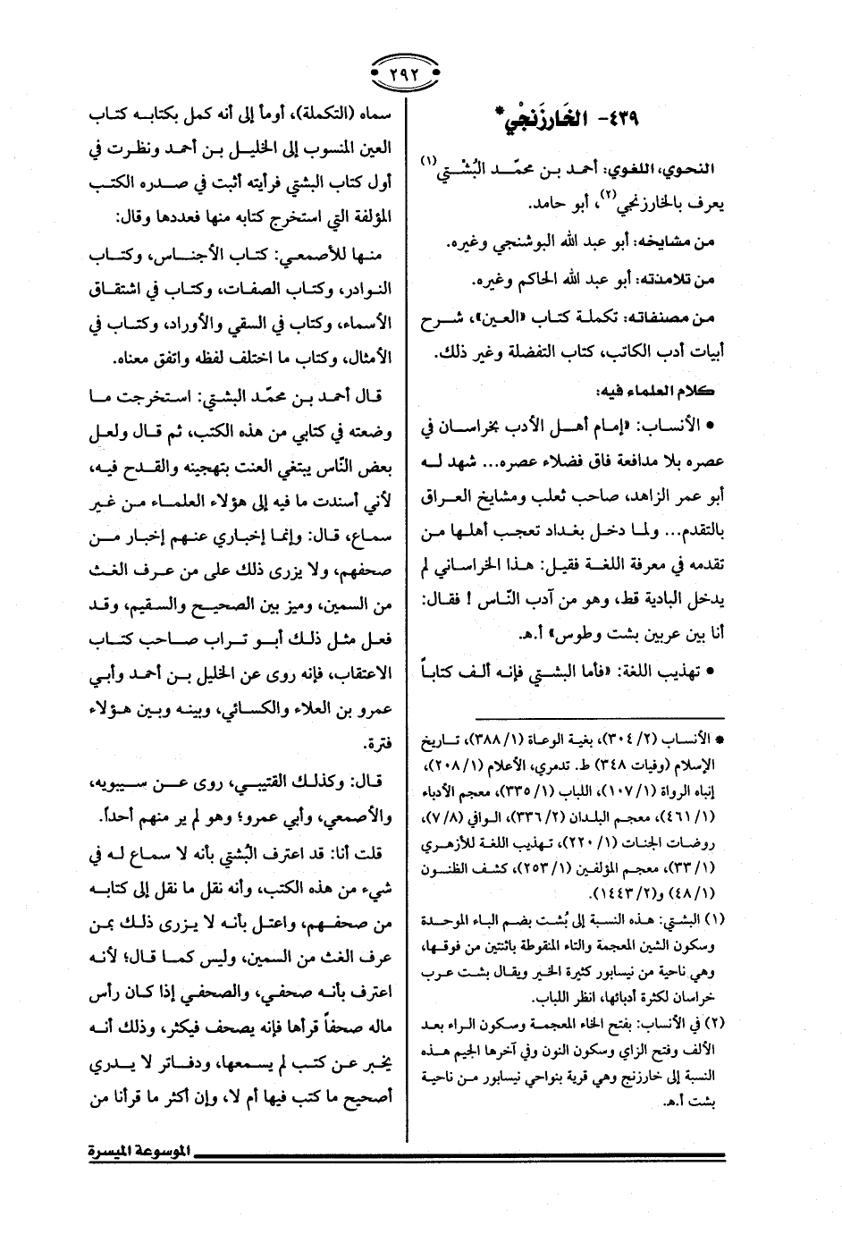 (¬2) في الأنساب: بفتح الخاء المعجمة وسكرن الراء بعد الألف وفتح الزاي وسكرن النون وفي آخرها الجيم هذه النسبة إلى خارزنج وهي قرية بنواحي نيسابور من ناحية بشت أ. هـ.