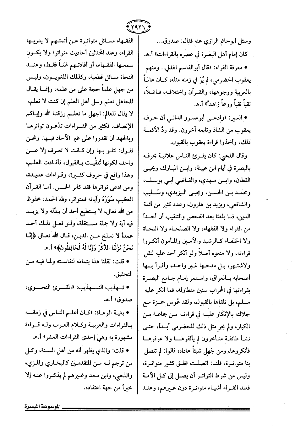 وقال الذهبي: كان يقرئ الناس علانية بحرفه بالبصرة في أيام ابن عيينة، وابن المبارك، ويحيى القطان، وابن مهدي، والقاضي أبي يوسف، ومحمد بن الحسن، ويحيى اليزيدي، وسُليم، والشافعي، ويزيد بن هارون، وعدد كثير من أئمة الدين، فما بلغنا بعد الفحص والتنقيب أن أحدًا من القراء ولا الفقهاء، ولا الصلحاء ولا النحاة ولا الخلفاء كالرشيد والأمين والمأمون أنكروا قراءته، ولا منعوه أصلًا ولو أنكر أحد عليه لنقل ولاشتهر، بل مدحها غير واحد، وأقرأ بها أصحابه بالعراق، واستمر إمام جامع البصرة بقراءتها في الحراب سنين متطاولة، فما أنكر عليه مسلم، بل تلقاها بالقبول، ولقد عُومل حمزة مع جلالته بالإنكار عليه في قراءته من جماعة من الكبار، ولم يجرِ مثل ذلك للحضرمي أبدًا، حتى نشأ طائفة متأخرون لم يألفوها ولا عرفوها فأنكروها، ومن جَهِل شيئًا عاداه، قالوا: لم تتصل بنا متواترة، قلنا: اتصلت بخلق كثير متواترة، وليس من شرط التواتر أن يصل إلى كل الأمة فعند القراء أشياء متواترة دون غيرهم، وعند الفقهاء مسائل متواترة عن أئمتهم لا يدريها القراء، وعند المحدثين أحاديث متواترة ولا يكون سمعها الفقهاء، أو أفادتهم ظنًّا فقط، وعند النحاة مسائل قطعية، وكذلك اللغويون، وليس من جهل علمًا حجة على من علمه، وإنما يقال للجاهل تعلم وسل أهل العلم إن كنت لا تعلم، لا يقال للعالم: اجهل ما تعلم رزقنا الله وإياكم الإنصاف. فكثير من القراءات تدّعون تواترها وبالجهد أن تقدروا على غير الآحاد فيها. ونحن نقول: نتلو بها وإن كانت لا تعرف إلا عن واحد، لكونها تُلقُيت بالقبول، فأفادت العلم، وهذا واقع في حروف كثيرة، وقراءات عديدة، ومن ادعى تواترها فقد كابر الحس. أما القرآن العظيم، سُوَرُهُ وآياته فمتواتر، ولله الحمد، محفوظ من الله تعالى، لا يستطيع أحد أن يبدِّله ولا يزيد فيه آية ولا جملة مستقلة، ولو فعل ذلك أحد عمدًا لا نسلخ من الدين، قال الله تعالى {إِنَّا نَحْنُ نَزَّلْنَا الذِّكْرَ وَإِنَّا لَهُ لَحَافِظُونَ} أ. هـ.