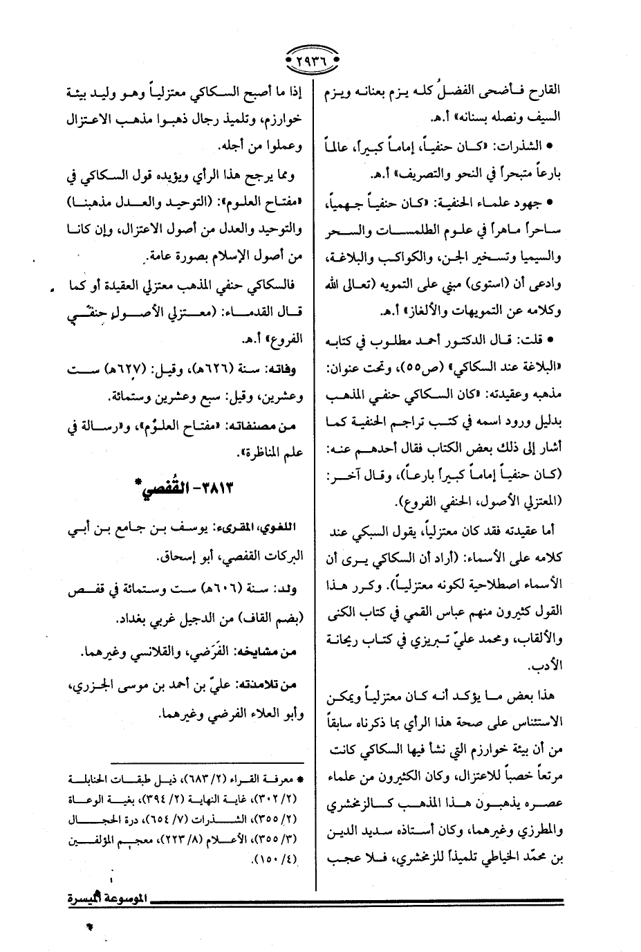 • قلت: قال الدكتور أحمد مطلوب في كتابه "البلاغة عند السكاكي" (ص 55)، وتحت عنوان: مذهبه وعقيدته: "كان السكاكي حنفي المذهب بدليل ورود اسمه في كتب تراجم الحنفية كما أشار إلى ذلك بعض الكتاب فقال أحدهم عنه: (كان حنفيًا إمامًا كبيرًا بارعًا)، وقال آخر: (المعتزلي الأصول، الحنفي الفروع).