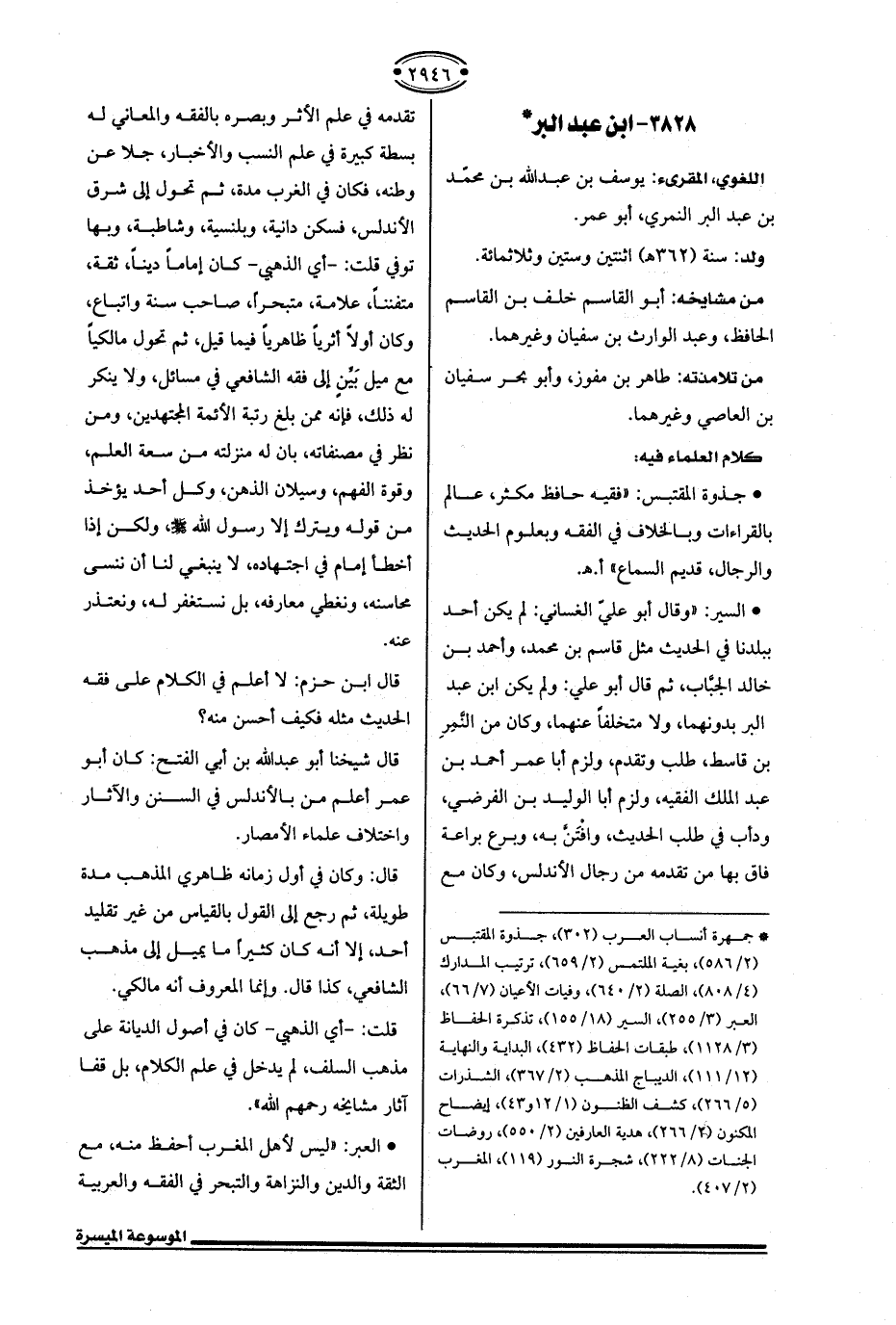 * السير: "وقال أبو عليّ الغساني: لم يكن أحد ببلدنا في الحديث مثل قاسم بن محمد، وأحمد بن خالد الجبّاب، ثم قال أبو علي: ولم يكن ابن عبد البر بدونهما، ولا متخلفًا عنهما، وكان من النَّمِرِ بن قاسط، طلب وتقدم، ولزم أبا عمر أحمد بن عبد الملك الفقيه، ولزم أبا الوليد بن الفرضي، ودأب في طلب الحديث، وافْتَنَّ به، وبرع براعة فاق بها من تقدمه من رجال الأندلس، وكان مع تقدمه في علم الأثر وبصره بالفقه والمعاني له بسطة كبيرة في علم النسب والأخبار، جلا عن وطنه، فكان في الغرب مدة، ثم تحول إلى شرق الأندلس، فسكن دانية، وبلنسية، وشاطبة، وبها توفي قلت: -أي الذهبي- كان إمامًا دينًا، ثقة، متفننًا، علامة، متبحرًا، صاحب سنة واتباع، وكان أولًا أثريًا ظاهريًا فيما قيل، ثم تحول مالكيًا مع ميل بَيِّنٍ إلى فقه الشافعي في مسائل، ولا ينكر له ذلك، فإنه ممن بلغ رتبة الأئمة المجتهدين، ومن نظر في مصنفاته، بان له منزلته من سعة العلم، وقوة الفهم، وسيلان الذهن، وكل أحد يؤخذ من قوله ويترك إلا رسول الله - صلى الله عليه وسلم -، ولكن إذا أخطأ إمام في اجتهاده، لا ينبغي لنا أن ننسى محاسنه، ونغطي معارفه، بل نستغفر له، ونعتذر عنه.