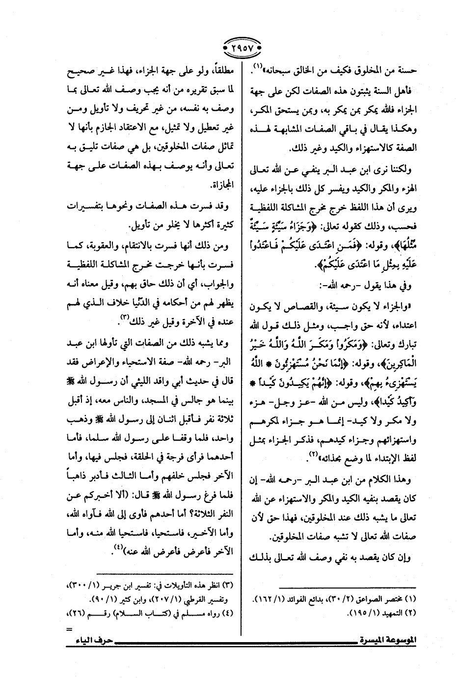 ولكننا نرى ابن عبد البر ينفي عن الله تعالى الهزء والمكر والكيد ويفسر كل ذلك بالجزاء عليه، ويرى أن هذا اللفظ خرج مخرج المشاكلة اللفظية فحسب، وذلك كقوله تعالى: {وَجَزَاءُ سَيِّئَةٍ سَيِّئَةٌ مِثْلُهَا}، وقوله: {فَمَنِ اعْتَدَى عَلَيكُمْ فَاعْتَدُوا عَلَيهِ بِمِثْلِ مَا اعْتَدَى عَلَيكُمْ}.