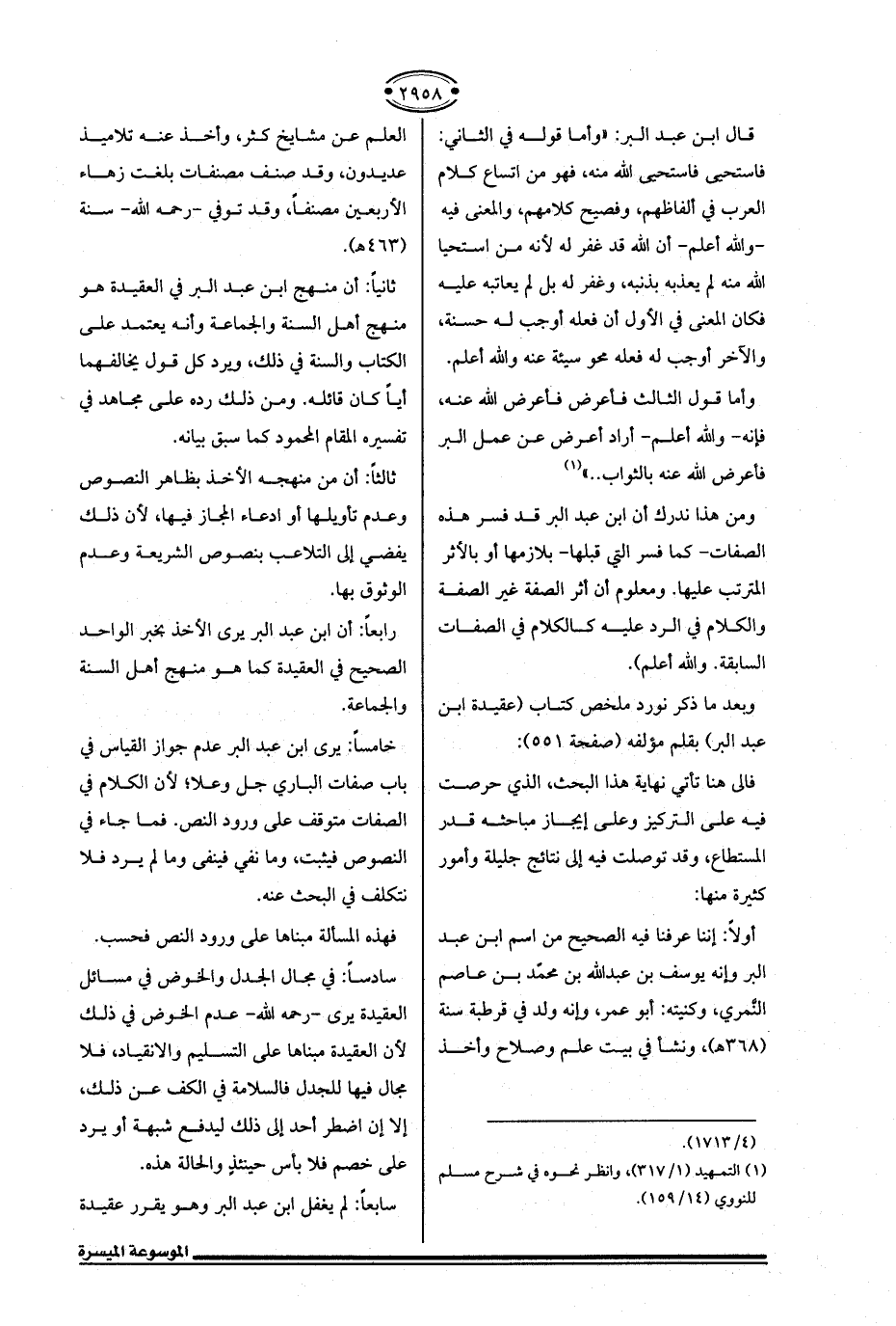 أولًا: إننا عرفنا فيه الصحيح من اسم ابن عبد البر وإنه يوسف بن عبد الله بن محمّد بن عاصم النَّمري، وكنيته: أبو عمر، وإنه ولد في قرطبة سنة (368 هـ)، ونشأ في بيت علم وصلاح وأخذ العلم عن مشايخ كثر، وأخذ عنه تلاميذ عديدون، وقد صنف مصنفات بلغت زهاء الأربعين مصنفًا، وقد توفي -رحمه الله- سنة (463 هـ).