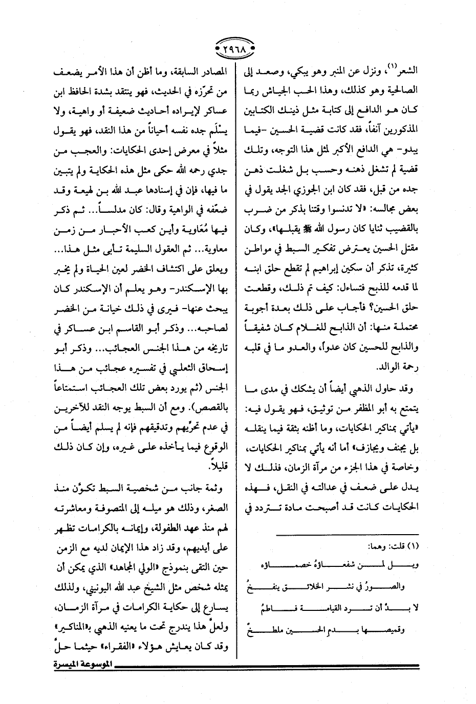 الشعر (¬1)، ونزل عن المنبر وهو يبكي، وصعد إلى الصالحية وهو كذلك، وهذا الحب الجياش ربما كان هو الدافع إلى كتابة مثل ذينك الكتابين المذكورين آنفًا، فقد كانت قضية الحسين -فيما يبدو- هي الدافع الأكبر لمثل هذا التوجه، وتلك قضية لم تشغل ذهنه وحسب بل شغلت ذهن جده من قبل، فقد كان ابن الجوزي الجد يقول في بعض مجالسه: "لا تدنسوا وقتنا بذكر من ضرب بالقضيب ثنايا كان رسول الله - صلى الله عليه وسلم - يقبلها"، وكان مقتل الحسين يعترض تفكير السبط في مواطن كثيرة، تذكر أن سكين إبراهيم لم تقطع حلق ابنه لما قدمه للذبح فتساءل: كيف تم ذلك، وقطعت حلق الحسين؟ فأجاب على ذلك بعدة أجوبة محتملة منها: أن الذابح للغلام كان شفيقًا والذابح للحسين كان عدوًا، والعدو ما في قلبه رحمة الوالد.