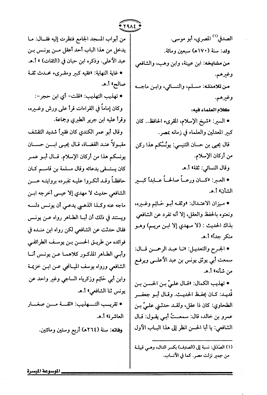 وقال أبو عمر الكندي كان فقيرًا شديد التقشف مقبولًا عند القضاة، قال يحيى بن حسان يونسكم هذا من أركان الإسلام. قال أبو عمر كان يستسقى بدعائه وقال مسلمة بن قاسم كان حافظًا وقد أنكروا عليه تفرده بروايته عن الشافعي حديث لا مهدي إلا عيسى أخرجه ابن ماجه عنه وكذا الذهبي يدعي أن يونس دلسه ويستند في ذلك أن أبا الطاهر رواه عن يونس فقال حدثت عن الشافعي لكن رواه ابن منده في فوائده من طريق الحسن بن يوسف الطرائفي وأبي الطاهر المذكور كلاهما عن يونس أنا الشافعي ورواه يوسف الميانجي عن ابن خزيمة وابن أبي حَاتِم وزكرياء الساجي وغير واحد عن يونس ثنا الشافعي" أ. هـ.