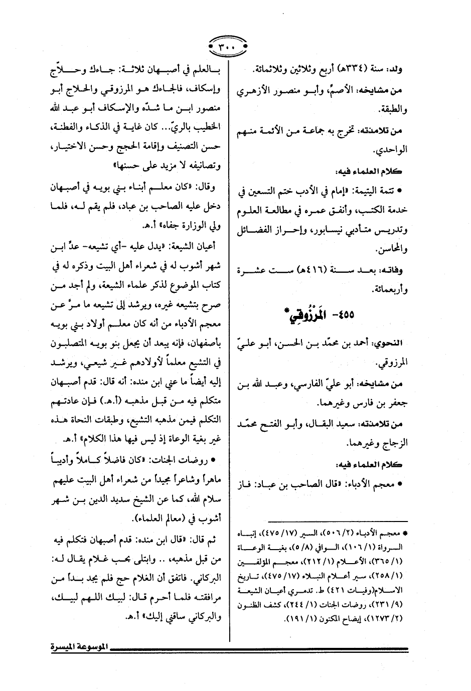 * معجم الأدباء (2/ 506)، السير (17/ 475)، إنباه الرواة (1/ 106)، الوافي (8/ 5)، بغية الوعاة (1/ 365)، الأعلام (1/ 212)، معجم المؤلفين (1/ 258)، سير أعلام النبلاء (17/ 475)، تاريخ الإسلام (وفيات 421) ط. تدمري أعيان الشيعة (9/ 231)، روضات الجنات (1/ 244)، كشف الظنون (2/ 1273)، إيضاح المكنون (1/ 191).