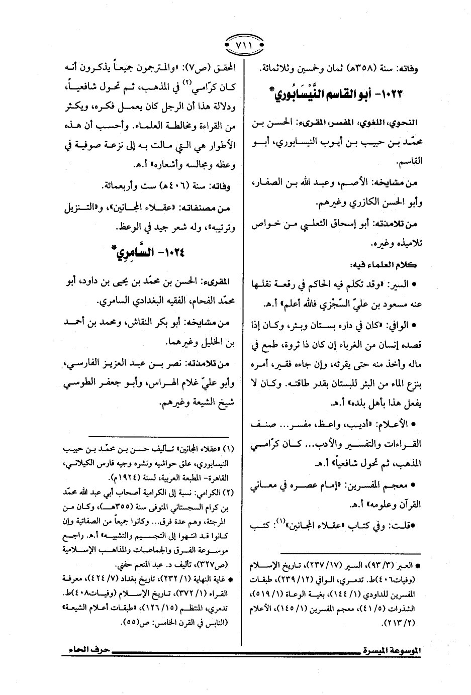 (¬2) الكرامي: نسبة إلي الكرامية أصحاب أبي عبد الله محمّد بن كرام السجستاني المتوفى منة (355 هـ)، وكان من المرجئة، وهم عدة فرق ... وكانوا جميعًا من الصفاتية وإن كانوا فد انتهوا إلي التجسيم والتشبيه" أ. هـ. راجع موسوعة الفرق والجماعات والمذاهب الإسلامية (ص 327)، تأليف د. عبد المنعم حفني.