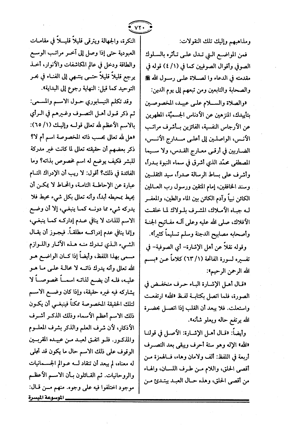 وقوله نقلًا عن أهل الإشارة -أي الصوفية- في تفسيره لسورة الفاتحة (1/ 63) كلامًا عن "بِسْمِ اللَّهِ الرَّحْمَنِ الرَّحِيمِ":