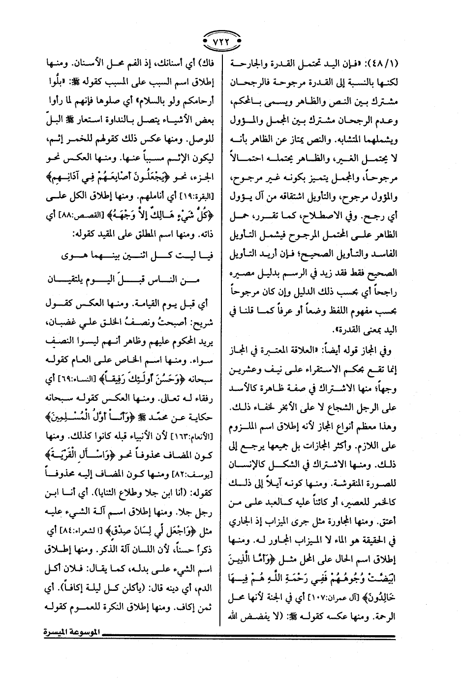 أي قبل يوم القيامة. ومنها العكس كقول شريح: أصبحتُ ونصفُ الخلق علي غضبان، يريد المحكوم عليهم وظاهر أنهم ليسوا النصف سواء. ومنها اسم الخاص علي العام كقوله سبحانه {وَحَسُنَ أولَئِكَ رَفِيقًا} [النساء: 69] أي رفقاء له تعالي. ومنها العكس كقوله سبحانه حكاية عن محمّد - صلى الله عليه وسلم - {وَأَنَا أَوَّلُ الْمُسْلِمِينَ} [الأنعام: 163] لأن الأنبياء قبله كانوا كذلك. ومنها كون المضاف محذوفًا نحو {وَاسْأَلِ الْقَرْيَةَ} [يوسف: 82] ومنها كون المضات إليه محذوفًا كقوله: (أنا ابن جلا وطلاع الثنايا). أي أنا ابن رجل جلا. ومنها إطلاق اسم آلة الشيء عليه مثل {وَاجْعَلْ لِي لِسَانَ صِدْقٍ} [الشعراء: 84] أي ذكرًا حسنًا، لأن اللسان آلة الذكر. ومنها إطلاق اسم الشيء علي بدله، كما يقال: فلان أكل الدم، أي دينه قال: (يأكلن كل ليلة إكافًا). أي ثمن إكاف. ومنها إطلاق النكرة للعموم كقوله