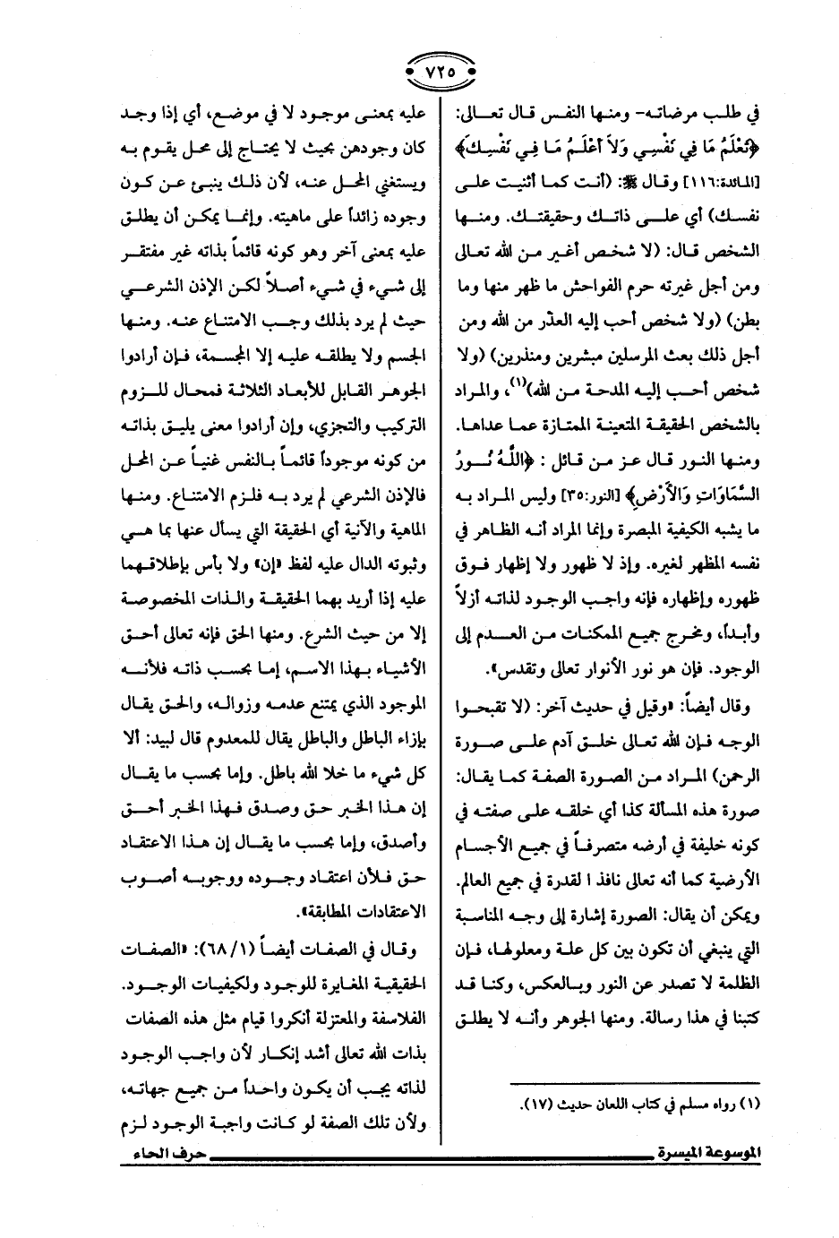 وقال أيضًا: "وقيل في حديث آخر: (لا تقبحوا الوجه فإن الله تعالى خلق آدم علي صورة الرحمن) المراد من الصورة الصفة كما يقال: صورة هذه المسألة كذا أي خلقه علي صفته في كونه خليفة في أرضه متصرفًا في جميع الأجسام الأرضية كما أنه تعالي نافذ القدرة في جميع العالم. ويمكن أن يقال: الصورة إشارة إلي وجه المناسبة التي ينبغي أن تكون بين كل علة ومعلولها، فإن الظلمة لا تصدر عن النور وبالعكس، وكنا قد كتبنا في هذا رسالة. ومنها الجوهر وأنه لا يطلق عليه بمعني موجود لا في موضع، أي إذا وجد كان وجودهن بحيث لا يحتاج إلي محل يقوم به ويستغني المحل عنه، لأن ذلك ينبئ عن كون وجوده زائدًا علي ماهيته. وإنما يمكن أن يطلق عليه بمعني آخر وهو كونه قائمًا بذاته غير مفتقر إلي شيء في شيء أصلًا لكن الإذن الشرعي حيث لم يرد بذلك وجب الامتناع عنه. ومنها الجسم ولا يطلقه عليه إلا الجسمة، فإن أرادوا الجوهر القابل للأبعاد الثلاثة فمحال للزوم التركيب والتجزي، وإن أرادوا معني يليق بذاته من كونه موجودًا قائمًا بالنفس غنيًّا عن المحل فالإذن الشرعي لم يرد به فلزم الامتناع. ومنها الماهية والآنية أي الحقيقة التي يسأل عنها بما هي وثبوته الدال عليه لفظا "إن" ولا بأس بإطلاقهما عليه إذا أريد بهما الحقيقة والذات المخصوصة إلا من حيث الشرع. ومنها الحق فإنه تعالي أحق الأشياء بهذا الاسم، إما بحسب ذاته فلأنه الموجود الذي يمتنع عدمه وزواله، والحق يقال بإزاء الباطل والباطل يقال للمعدوم قال لبيد: ألا كل شيء ما خلا الله باطل. وإما بحسب ما يقال إن هذا الخبر حق وصدق فهذا الخبر أحق وأصدق، وإما بحسب ما يقال إن هذا الاعتقاد حق فلأن اعتقاد وجوده ووجوبه أصوب الاعتقادات المطابقة".