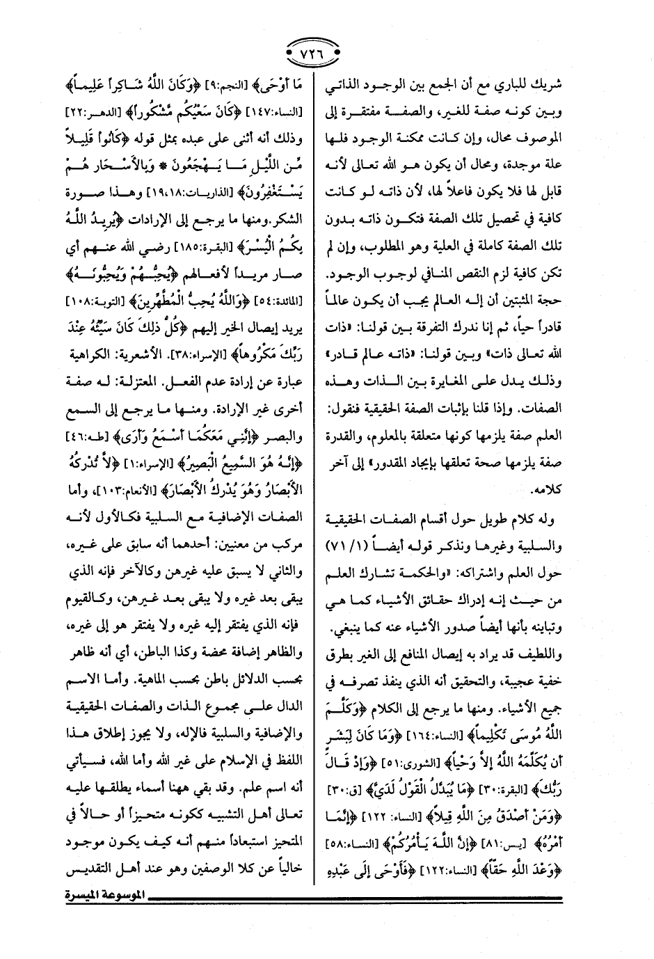 وله كلام طويل حول أقسام الصفات الحقيقية والسلبية وغيرها ونذكر قوله أيضًا (1/ 71) حول العلم واشتراكه: "والحكمة تشارك العلم من حيث إنه إدراك حقائق الأشياء كما هي وتباينه بأنها أيضًا صدور الأشياء عنه كما ينبغي. واللطيف قد يراد به إيصال المنافع إلي الغير بطرق خفية عجيبة، والتحقيق أنه الذي ينفذ تصرفه في جميع الأشياء. ومنها ما يرجع إلي الكلام {وَكَلَّمَ اللَّهُ مُوسَى تَكْلِيمًا} [النساء: 164] {وَمَا كَانَ لِبَشَرٍ أن يُكَلِّمَهُ اللهُ إلَّا وَحْيًا) [الشوري: 51] {وَإذْ قَال رَبُّكَ) [البقرة: 30] {مَا يُبَدَّلُ الْقَوْلُ لَدَيَّ} [ق: 30] {وَمَنْ أصْدَقُ مِنَ اللهِ قِيلًا} [النساء: 122] {إنَّمَا أمْرُهُ} [يس: 81] {إنَّ اللهَ يَأْمُرُكُمْ} [النساء: 58] {وَعْدَ اللهِ حَقًّا} [النساء: 122] {فَأَوْحَي إلَي عَبْدِهِ مَا أوْحَي} [النجم: 9] {وَكَانَ اللهُ شَاكِرًا عَلِيمًا} [النساء: 147] {كَانَ سَعْيُكُم مَّشْكُورًا} [الدهر: 22] وذلك أنه أثني علي عبده بمثل قوله {كَانُوا قَلِيلًا مِنَ اللَّيلِ مَا يَهْجَعُونَ (17) وَبِالْأَسْحَارِ هُمْ يَسْتَغْفِرُونَ} [الذاريات: 17، 18] وهذا صورة الشكر. ومنها ما يرجع إلي الإرادات {يُرِيدُ اللَّهُ بِكُمُ الْيُسْرَ} [البقرة: 185] رضي الله عنهم أي صار مريدًا لأفعالهم {يُحِبُّهُمْ وَيُحِبُّونَهُ} [المائدة: 54] {وَاللَّهُ يُحِبُّ الْمُطَّهِّرِينَ} [التوبة: 108] يريد إيصال الخير إليهم {كُلُّ ذَلِكَ كَانَ سَيِّئُهُ عِنْدَ رَبِّكَ مَكْرُوهًا (38)} [الإسراء: 38]. الأشعرية: الكراهية عبارة عن إرادة عدم الفعل. المعتزلة: له صفة أخرى غير الإرادة. ومنها ما يرجع إلي السمع والبصر {إِنَّنِي مَعَكُمَا أَسْمَعُ وَأَرَى} [طه: 46] {إِنَّهُ هُوَ السَّمِيعُ الْبَصِيرُ} [الإسراء: 1] {لَا تُدْرِكُهُ الْأَبْصَارُ وَهُوَ يُدْرِكُ الْأَبْصَارَ} [الأنعام: 103] , وأما الصفات الإضافية مع السلبية فكالأول لأنه مركب من معنيين: أحدهما أنه سابق علي غيره، والثاني لا يسبق عليه غيرهن وكالآخر فإنه الذي يبقي بعد غيره ولا يبقي بعد غيرهن، وكالقيوم فإنه الذي يفتقر إليه غيره ولا يفتقر هو إلي غيره، والظاهر إضافة محضة وكذا الباطن، أي أنه ظاهر بحسب الدلائل باطن بحسب الماهية. وأما الاسم الدال علي مجموع الذات والصفات الحقيقية والإضافية والسلبية فالإله، ولا يجوز إطلاق هذا اللفظ في الإسلام علي غير الله وأما الله، فسيأتي أنه اسم علم. وقد بقي ها هنا أسماء يطلقها عليه تعالي أهل التشبيه ككونه متحيزًا أو حالًا في المتحيز استبعادًا منهم أنه كيف يكون موجود خاليًا عن كلا الوصفين وهو عند أهل التقديس